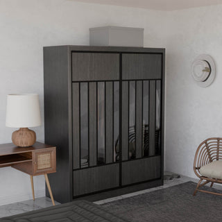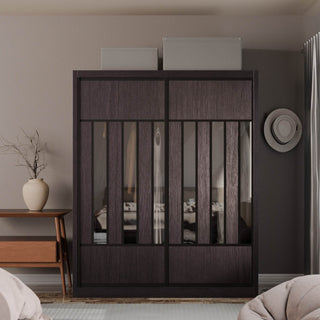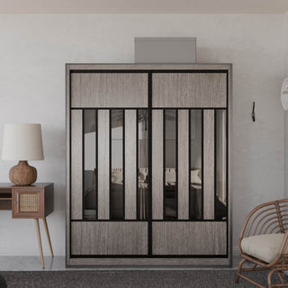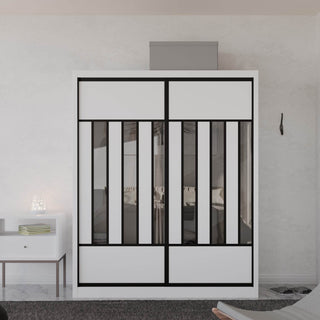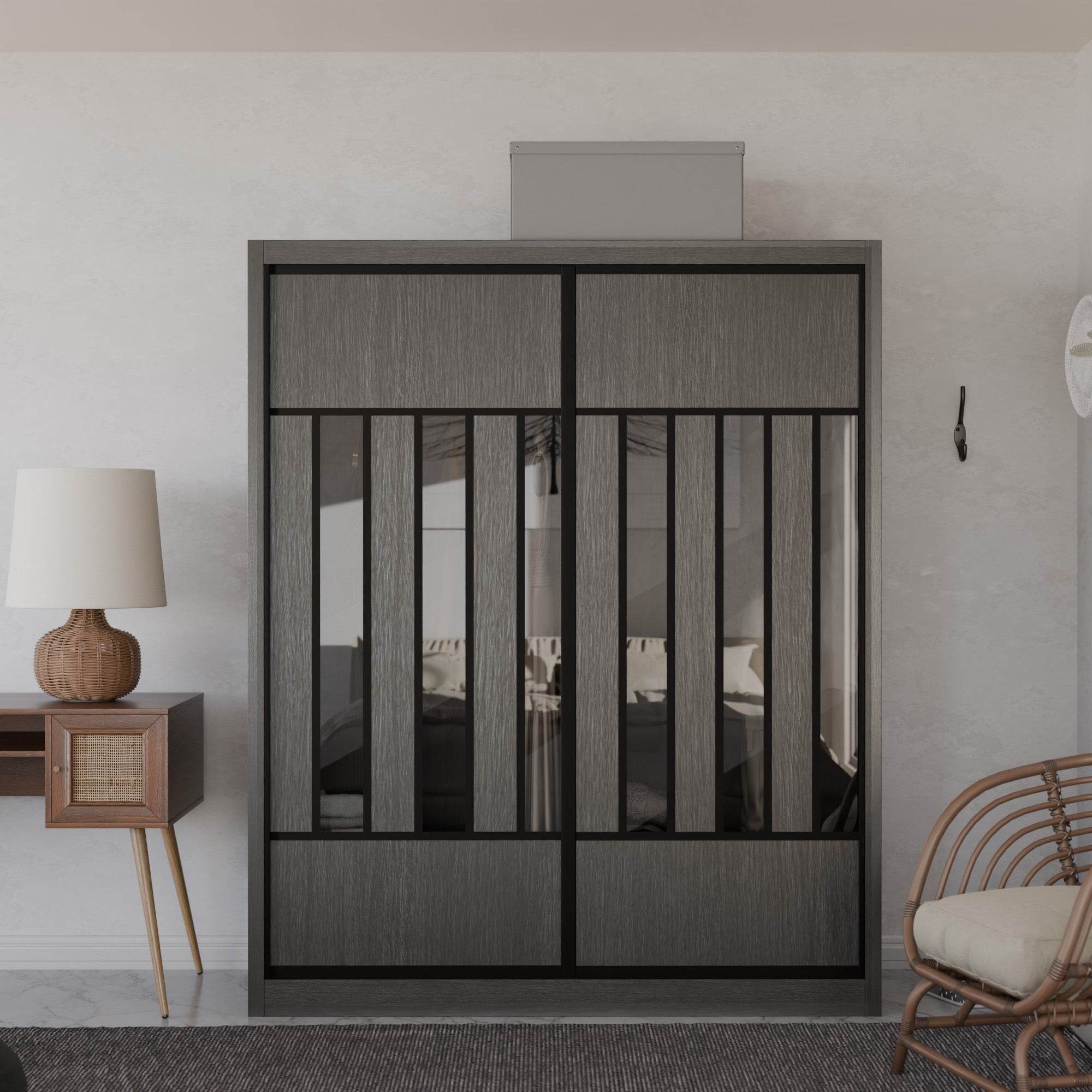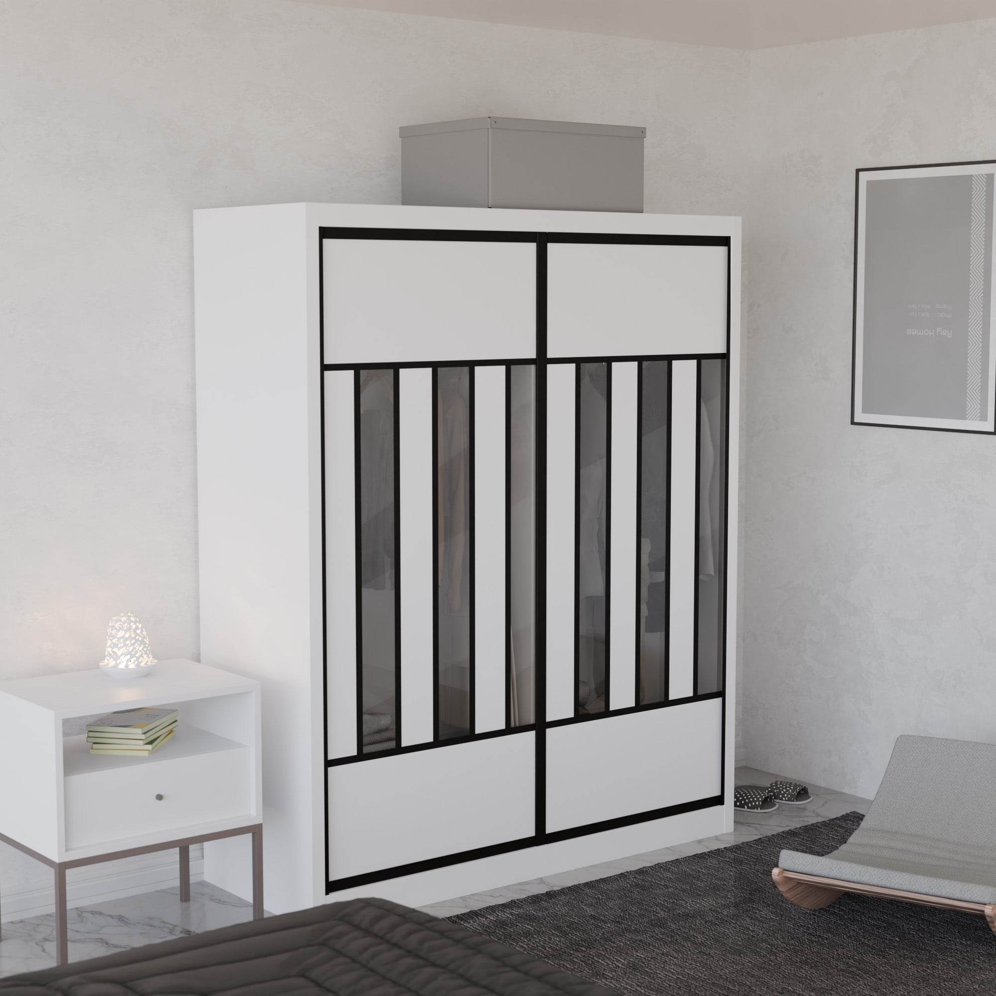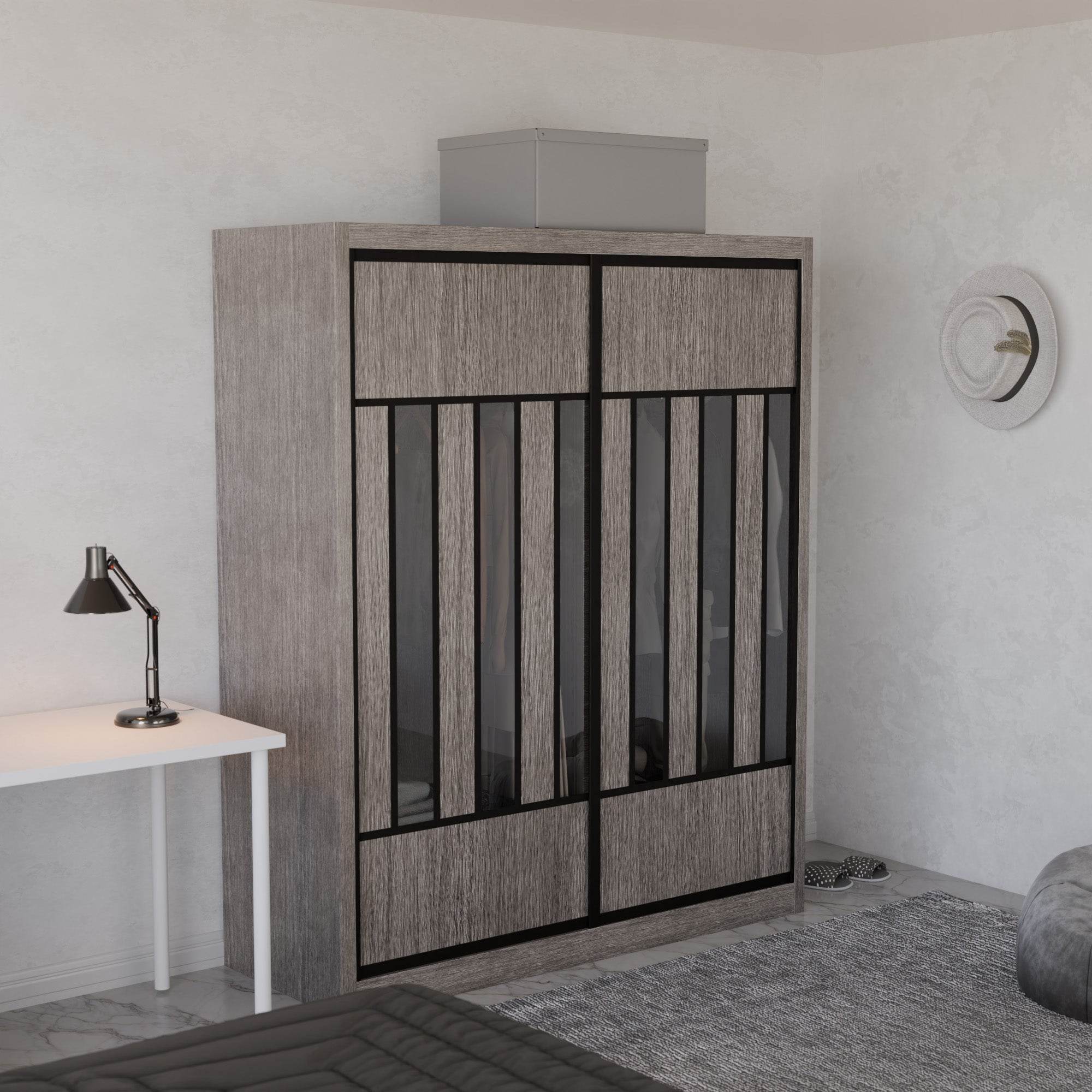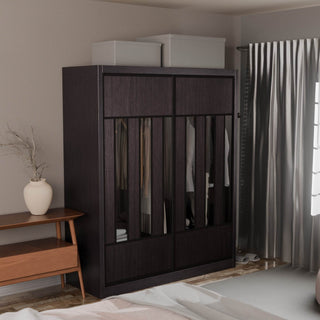 The Becca Modular Wardrobe frame is constructed with particle board frame, with a plywood backing and laminate finish. The doors are made of wooden laminate that slides on a smooth sliding door track system.