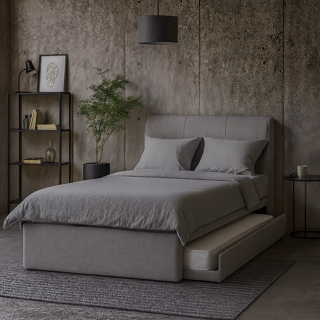 Specially designed for shared rooms, Princeton 3 In 1 Fabric Pull Out Bed Frame offers a spacious upholstered bed frame made with high-quality water resistant synthetic leather and auto-spring lift system trundle bed.