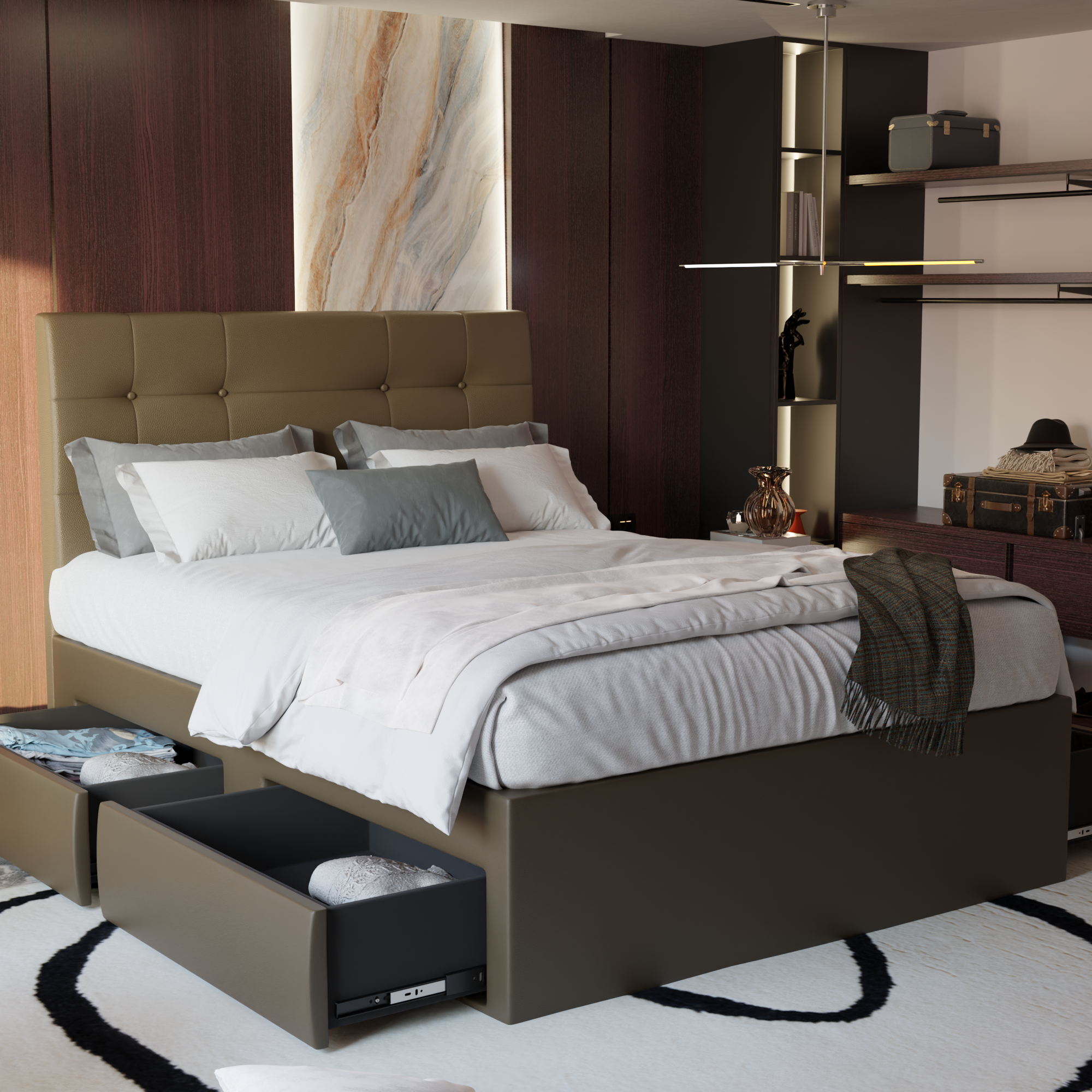 Introducing the Jaxon Faux Leather Drawer Bed Frame boasts a sleek and contemporary design, featuring high-quality faux leather upholstery that gives elegance to any bedroom décor. Constructed with durability, the sturdy frame ensures long-lasting support for your mattress as it provides a reliable foundation for a restful night’s sleep and maximises your bedroom storage with its convenient built-in drawers.