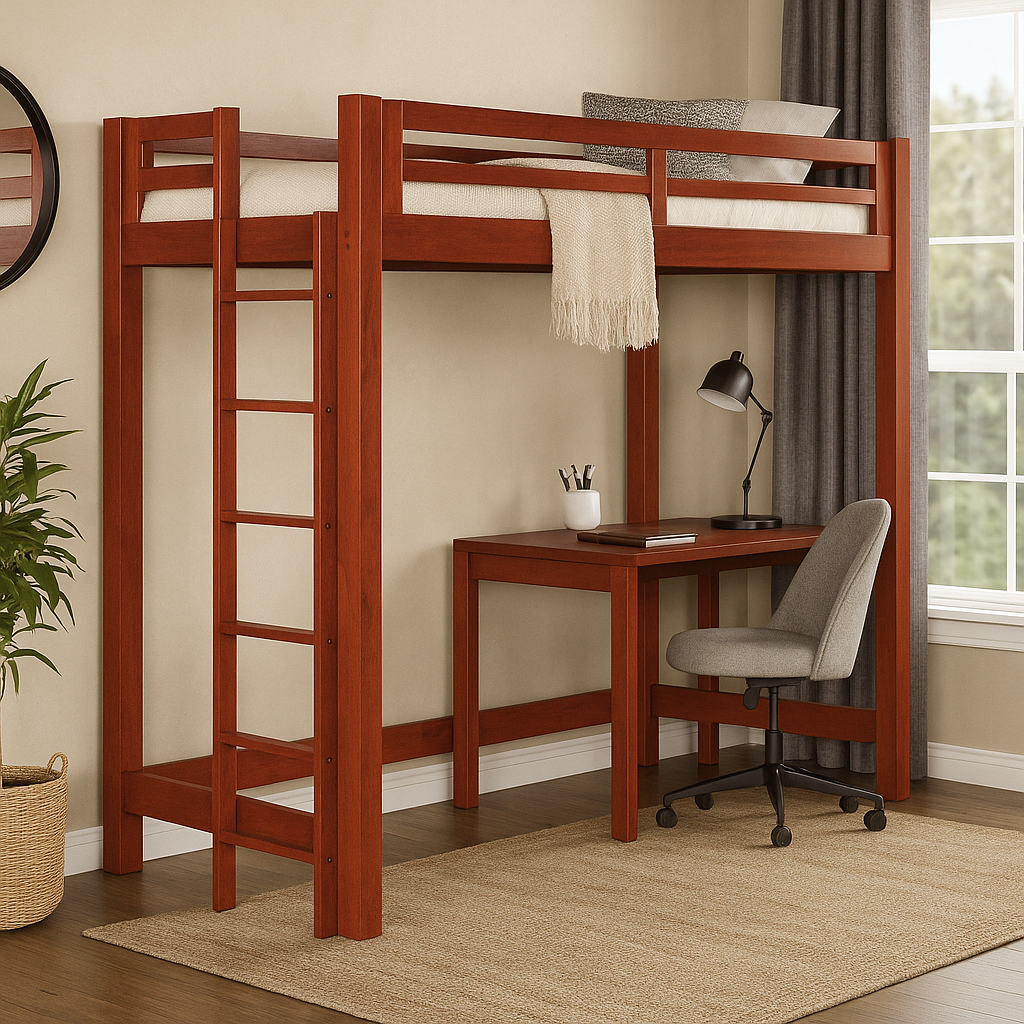 Crafted from solid rubberwood, the Alaire Wooden Loft Bed Frame (Cherry) is the perfect blend of style and efficiency. Its clean lines and natural wood finish make it a versatile addition to any bedroom. Designed for maximum functionality, the loft space beneath can accommodate a desk, a small wardrobe, or even a cozy lounge area.