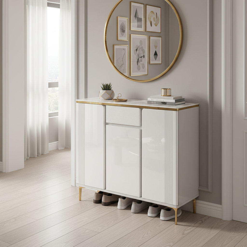 This shoe cabinet radiates a sophisticated and stylish allure, ideal for a touch of elegance at the entryway.
