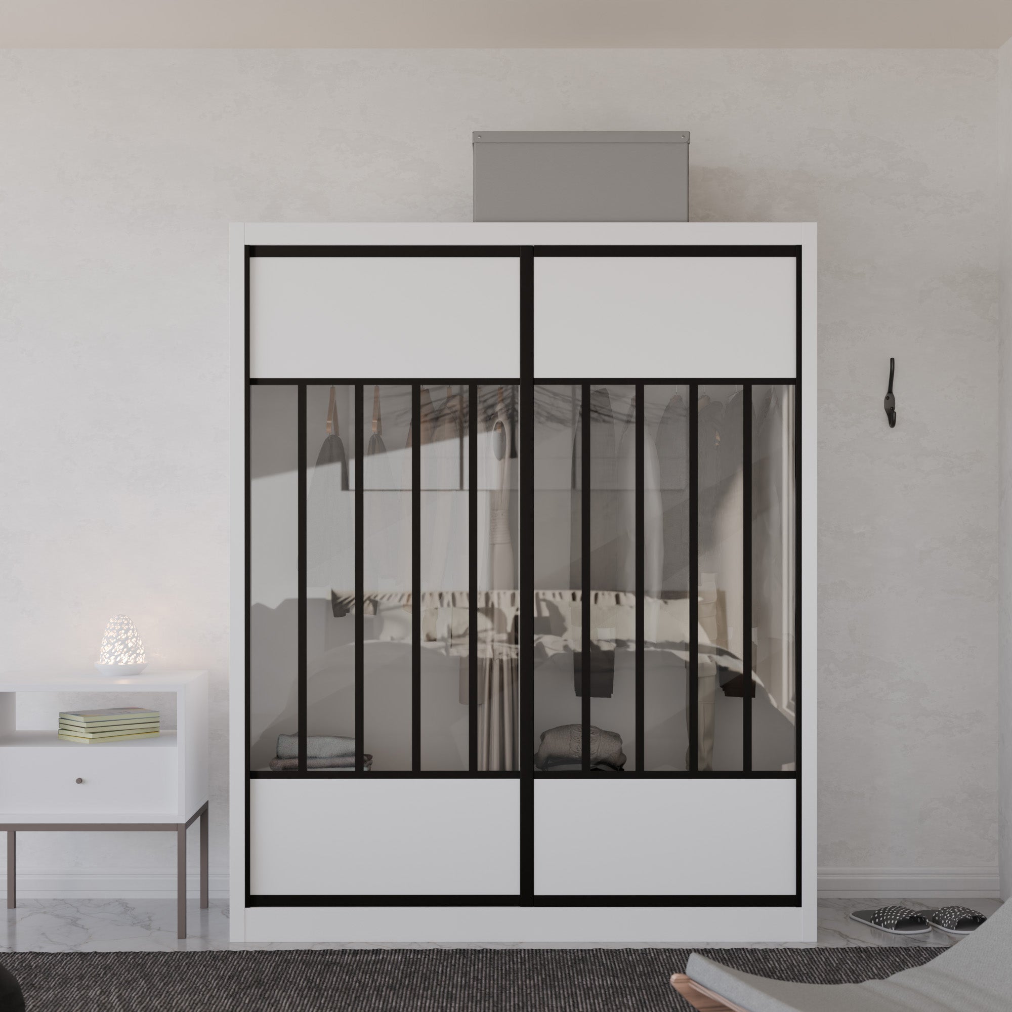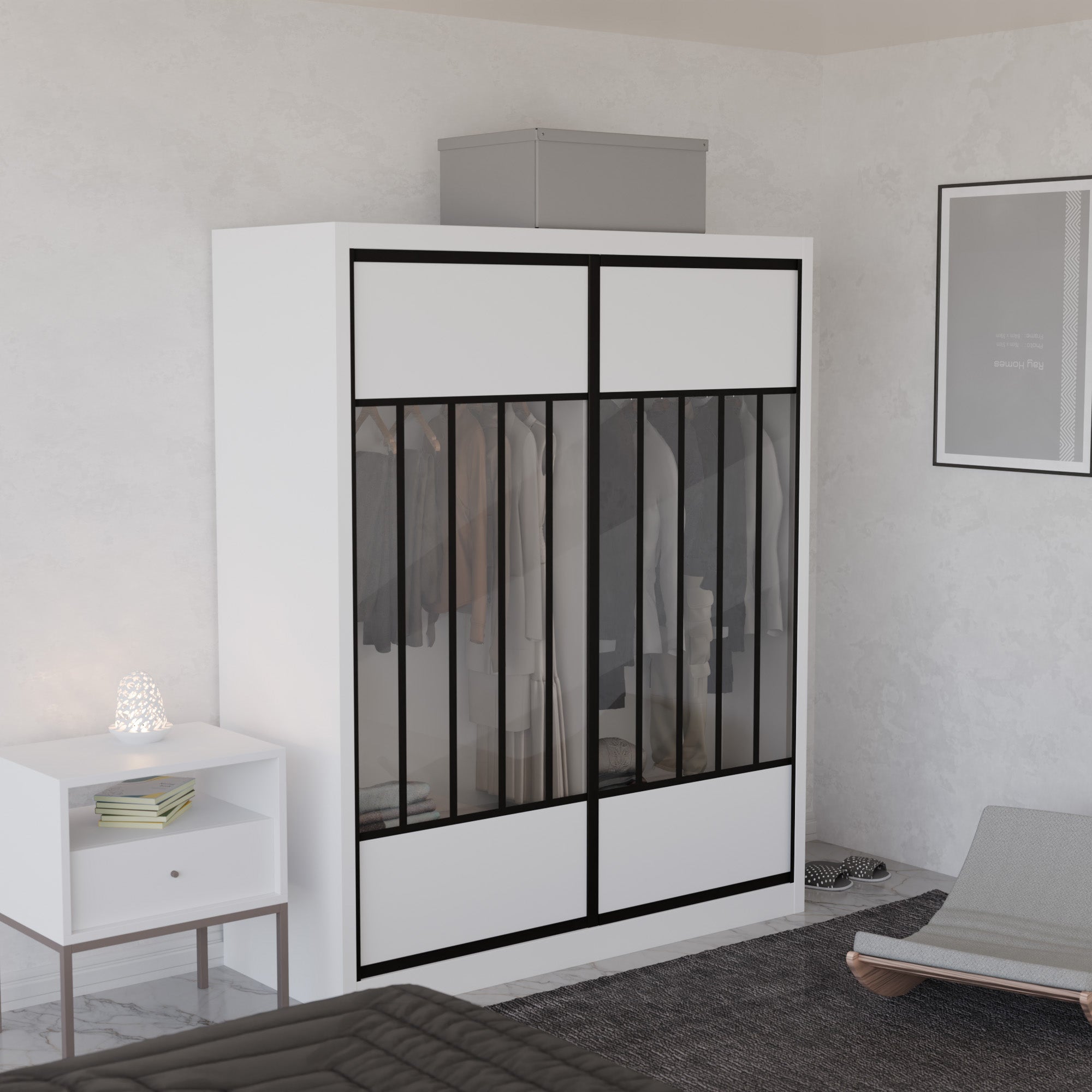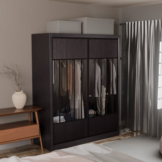 The Aldona Modular Wardrobe is a functional and stylish storage solution for our bedroom. Made with a sturdy particle board frame and plywood backing, this wardrobe can withstand daily use. The laminate finish gives elegance to the overall design, making it a perfect addition to any modern interior. The sliding door track system allows easy access to your clothes and personal items, while the aluminium-framed glass sliding doors add a contemporary touch. With ample storage space and a sleek design, the Aldona Modular Wardrobe is a practical and stylish choice for organising your wardrobe.