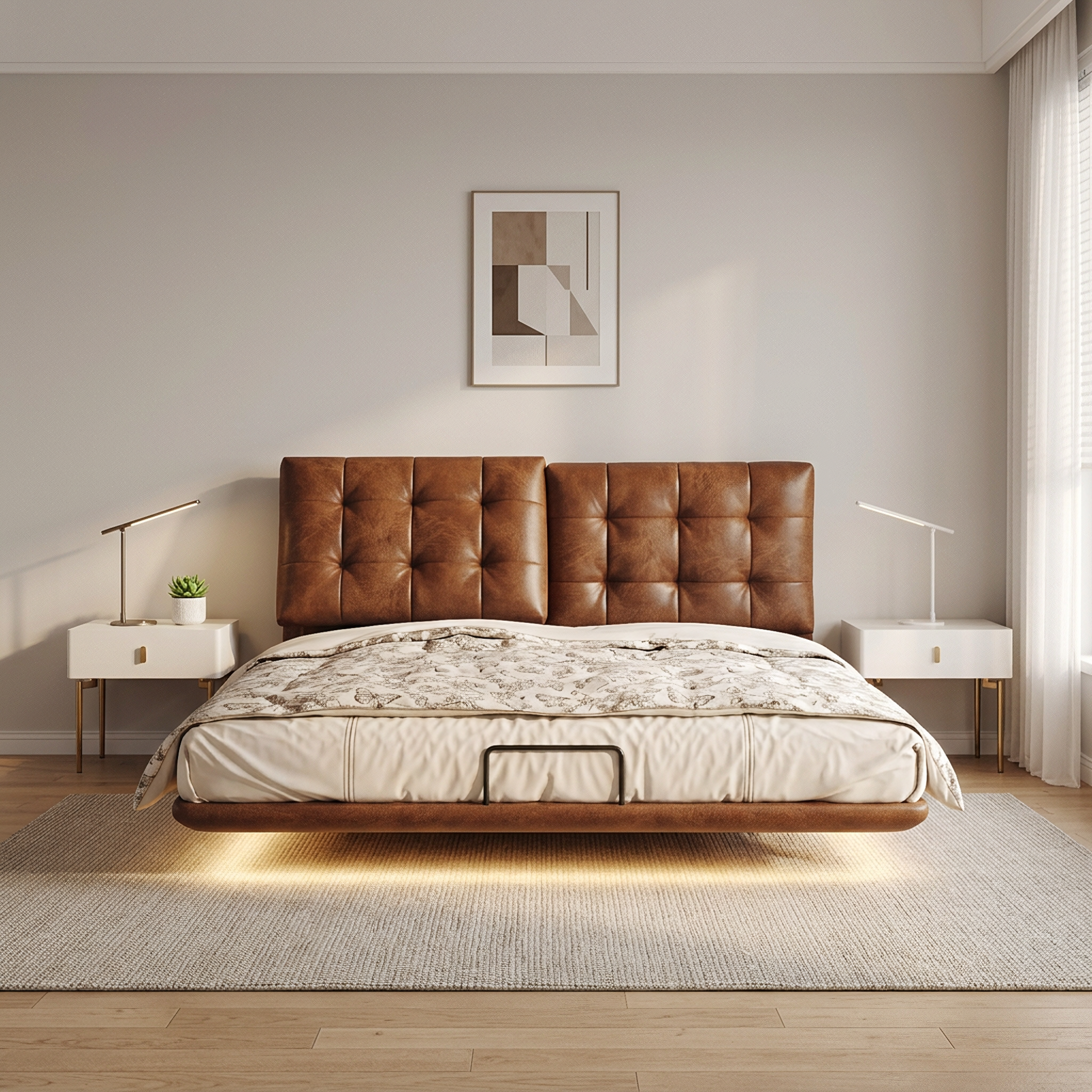 Adding a distinctive design feature, the bed incorporates a floating base with integrated ambient lighting, creating a soft under-bed glow that enhances the room’s atmosphere while giving the frame a sleek floating appearance. This modern lighting detail elevates both style and functionality within the bedroom space.