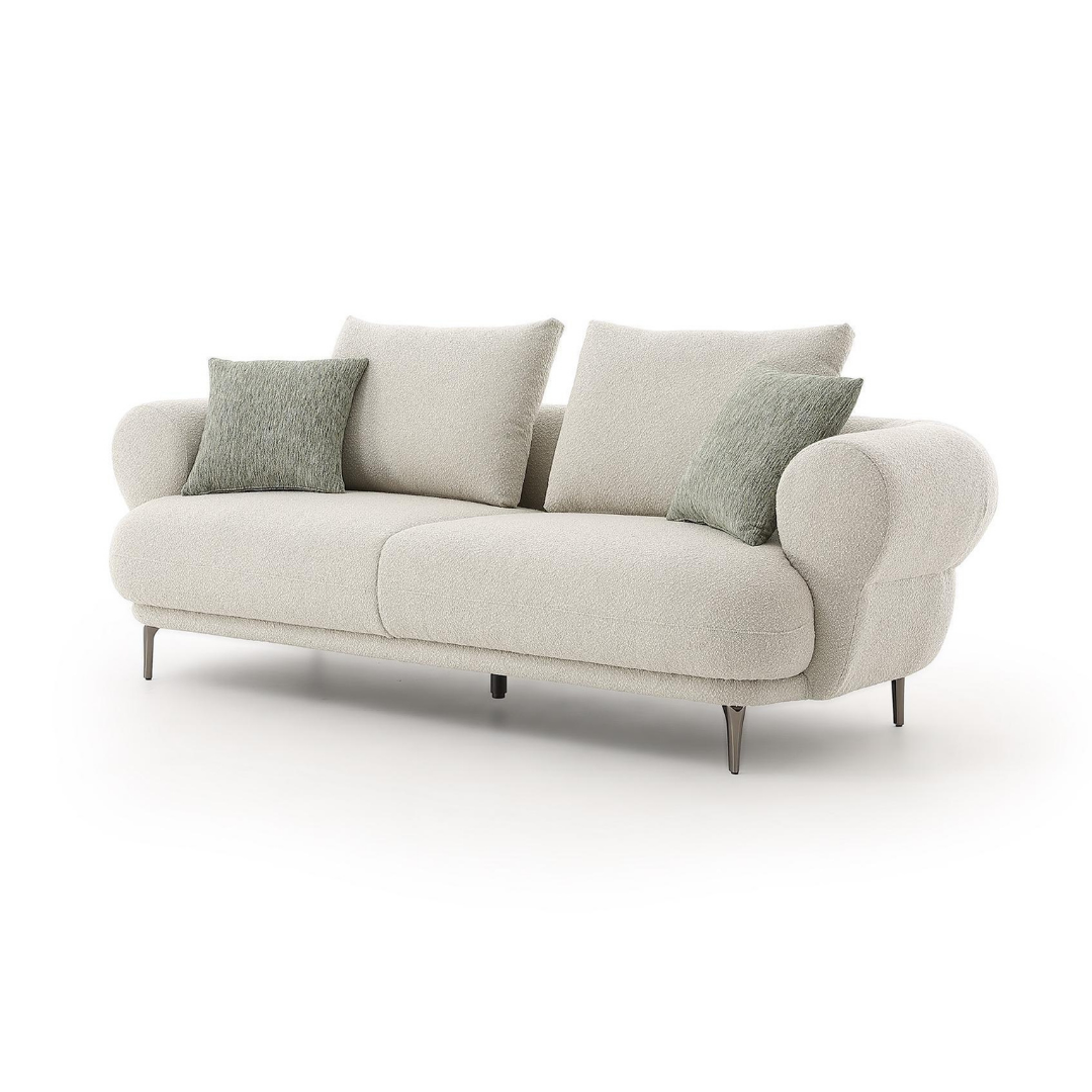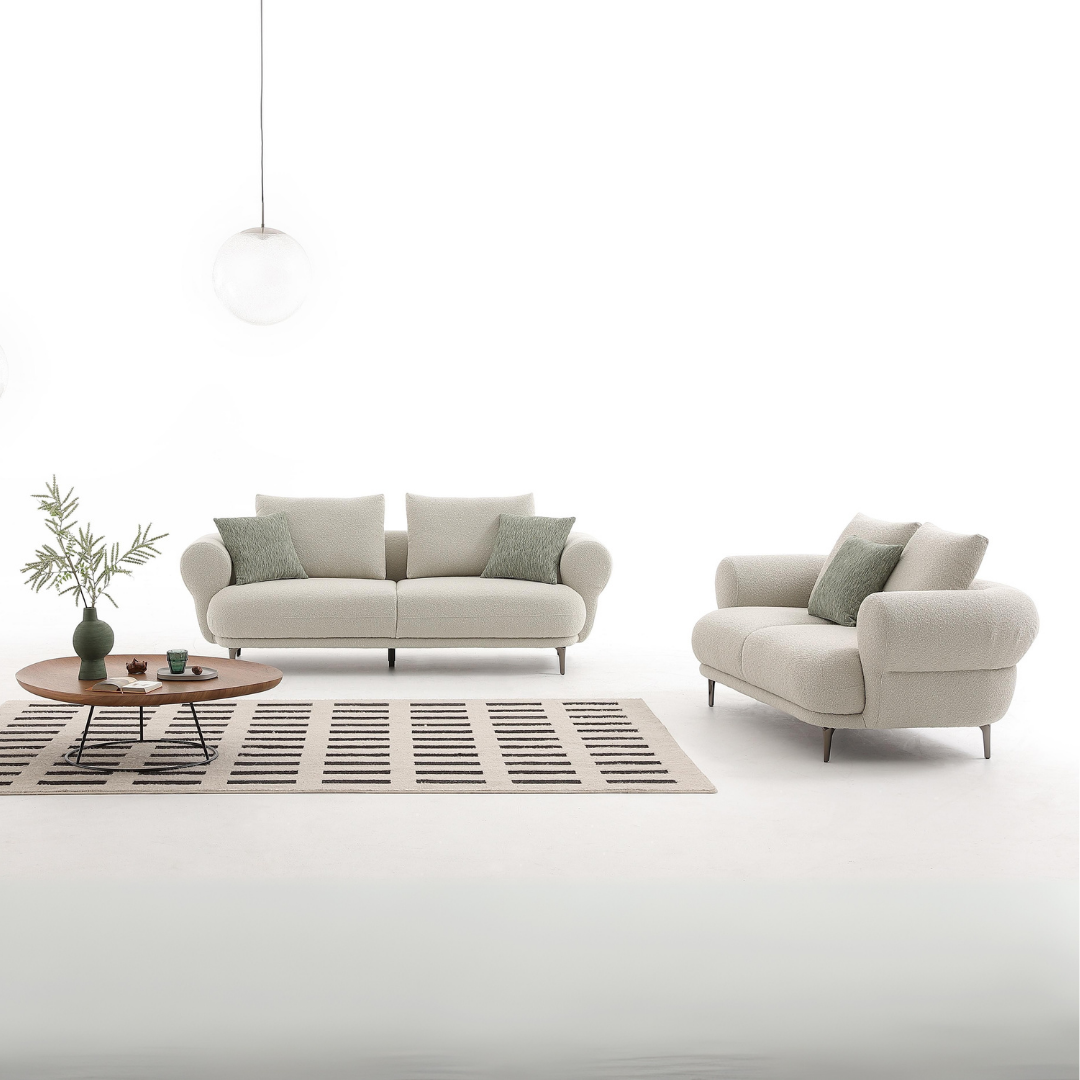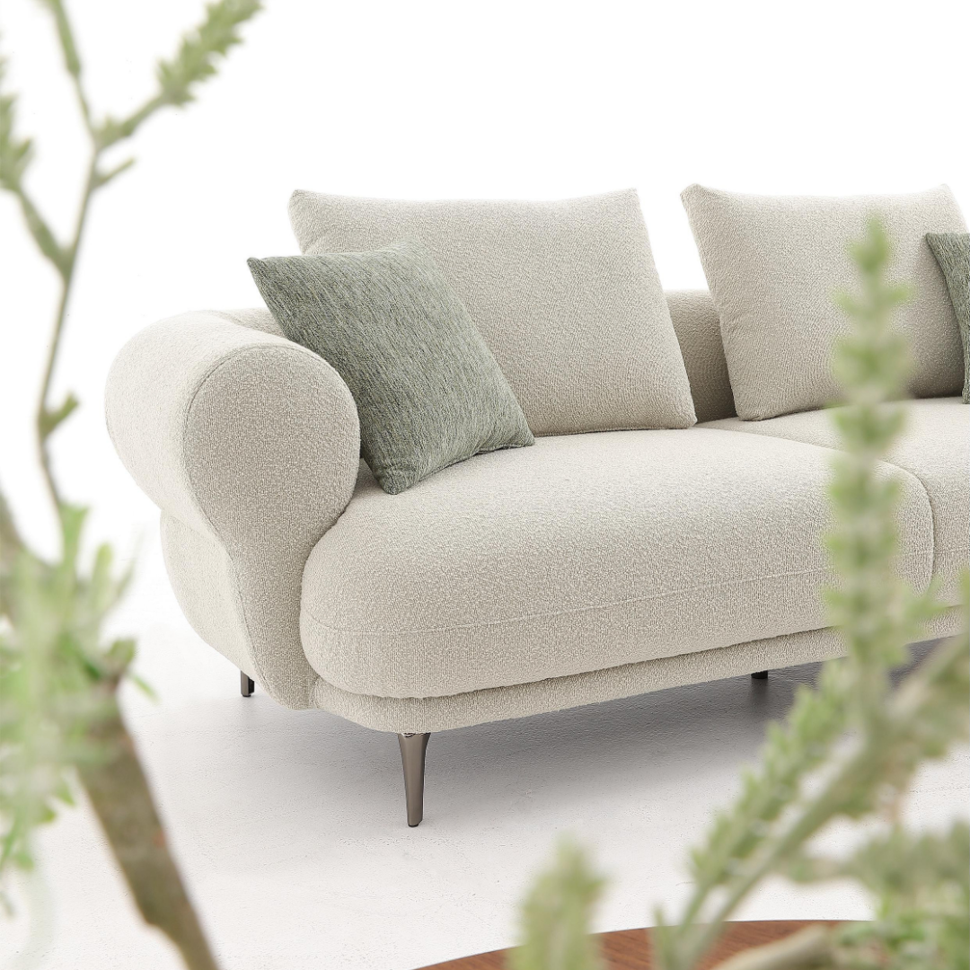 The Amabilia Boucle Fabric Sofa is where comfort meets modern Scandinavian charm. Upholstered in plush boucle fabric, this sofa offers a warm, textured feel that invites relaxation. Its clean silhouette and slender metal legs give it a contemporary edge while maintaining a soft, playful aesthetic.