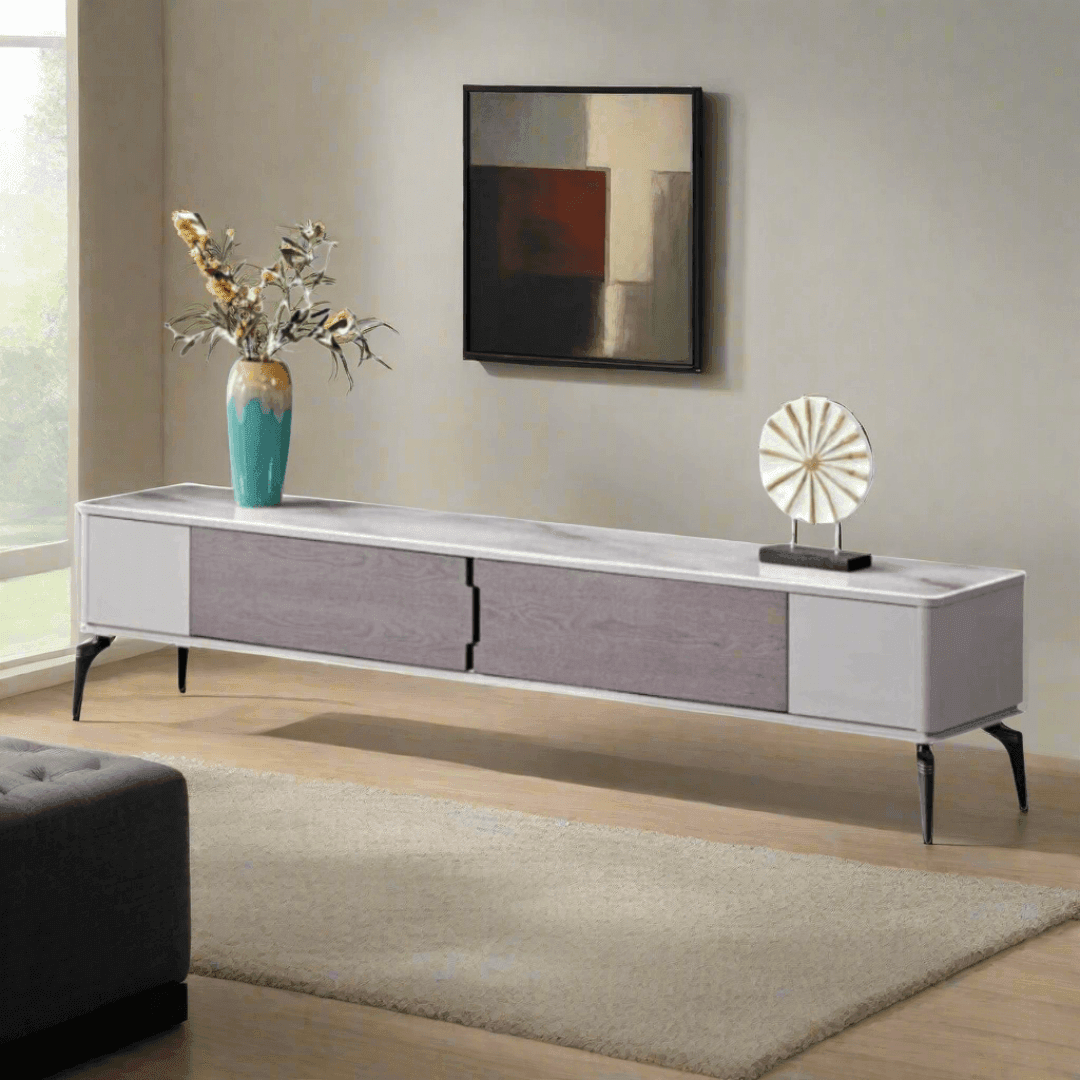 The Amadeus Glossy Sintered Stone TV Console isn€™t just any TV stand. Its glossy sintered stone top is a total eye-catcher, and guess what? It's super easy to clean, The body? Sturdy MDF wood, built to last. And those sleek metal legs aren€™t just for show; they're solid support for your binge-watching marathons.