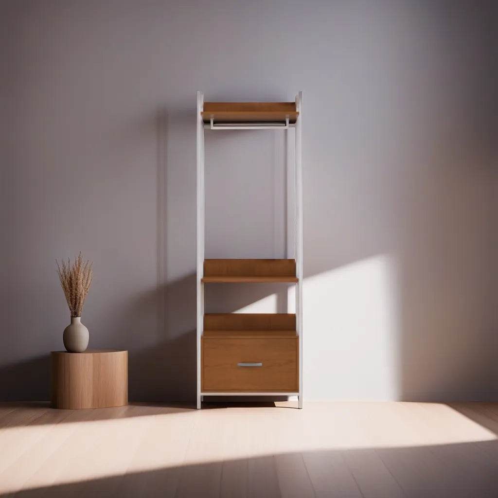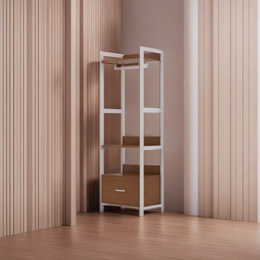 - Open shelving with a metal hangar for clothes