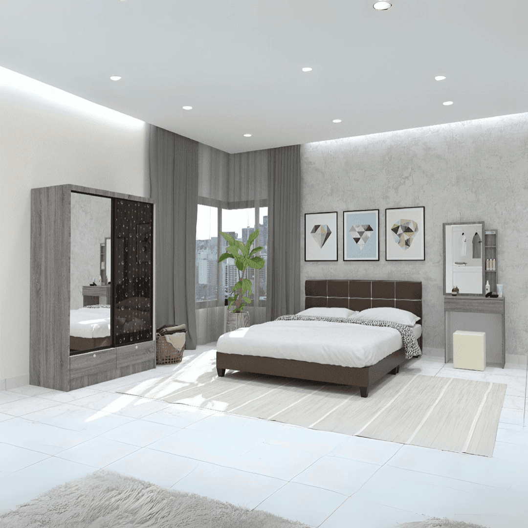 1 x Queen Sized Bed, 1 x Dressing Table with Stool, and 1 x Sliding Door Wardrobe.