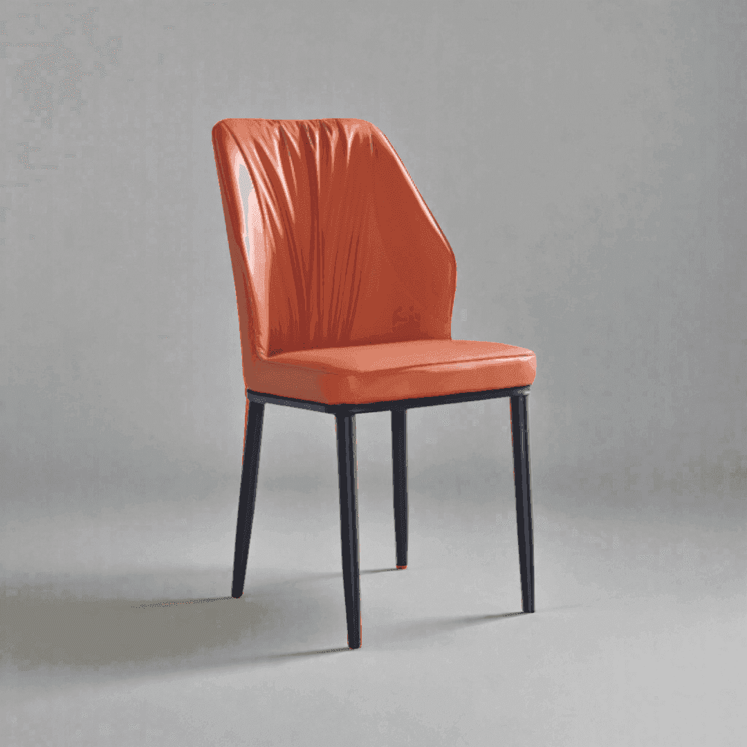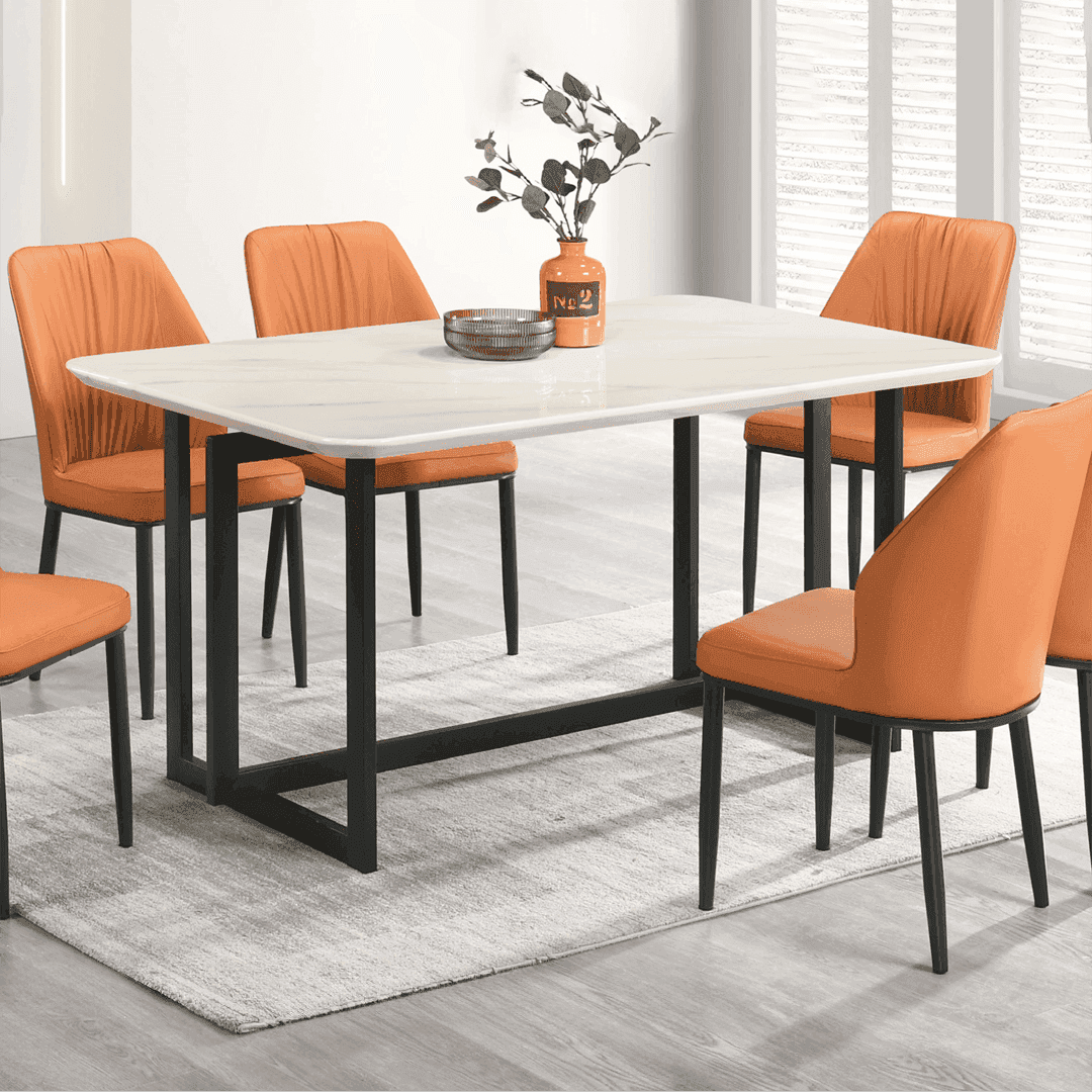 Revamp your dining area with the Antonella Marble Dining Set (1+6). This eye-catching set showcases a sophisticated marble surface that will enhance any dining occasion. Take a chance and make a statement with this striking and motivating dining table. Paired with vibrant orange faux leather dining chairs for a pop of color in your household.