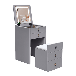 The Aquina Light Grey Dressing Table with Dressing Stool offers a compact design that maximizes storage space. Featuring a tri-tone LED mirror light with white, warm, and cool settings, this table also has a soft close flip top that can conceal the mirror when not in use. Included is a matching dressing stool.