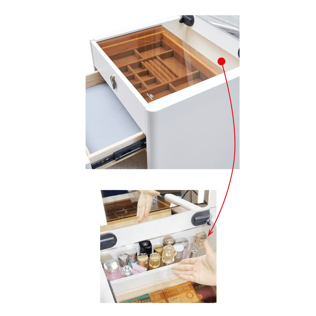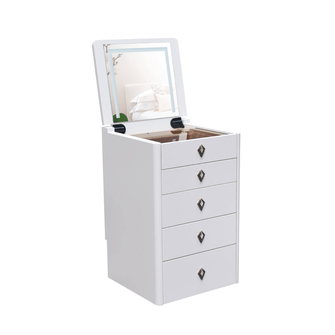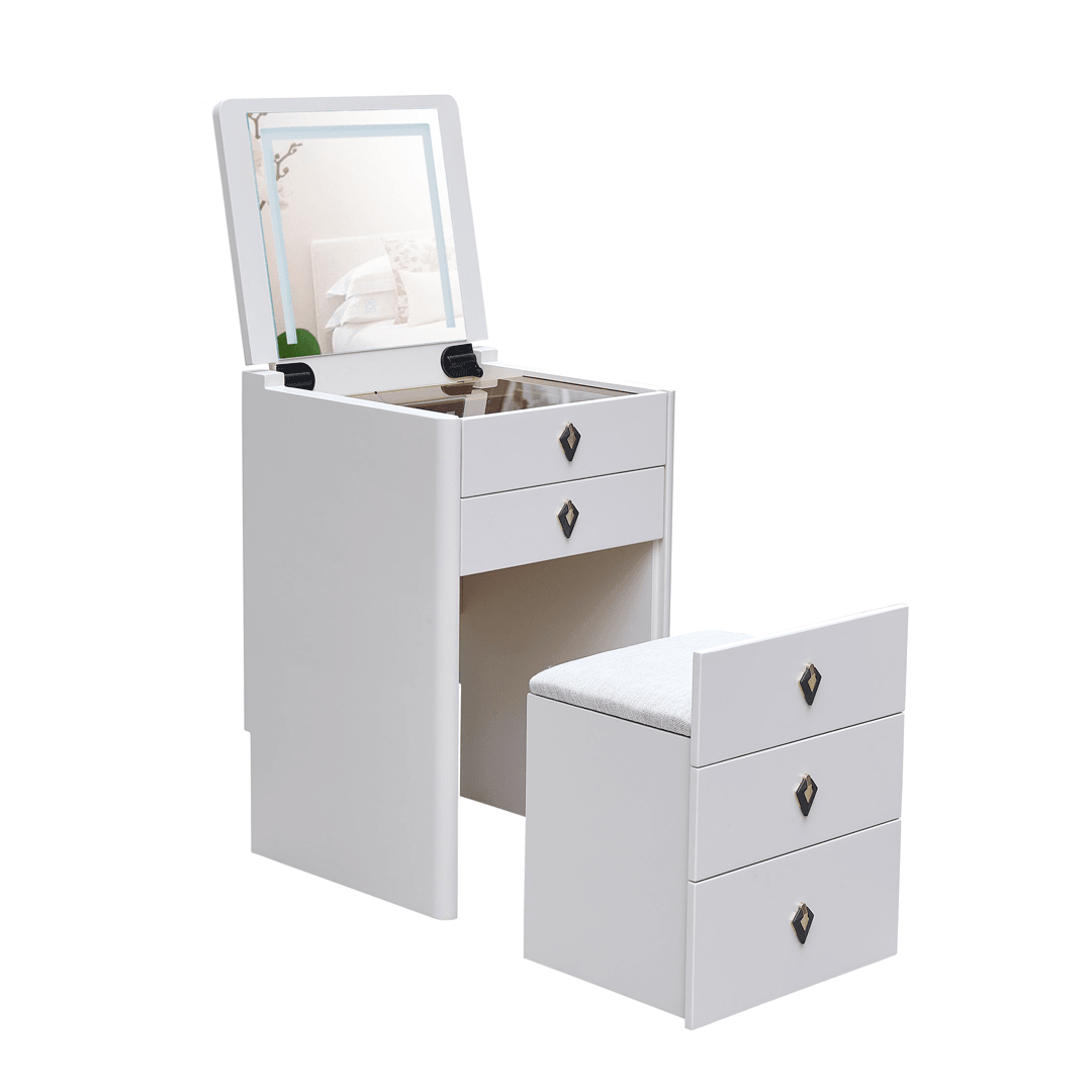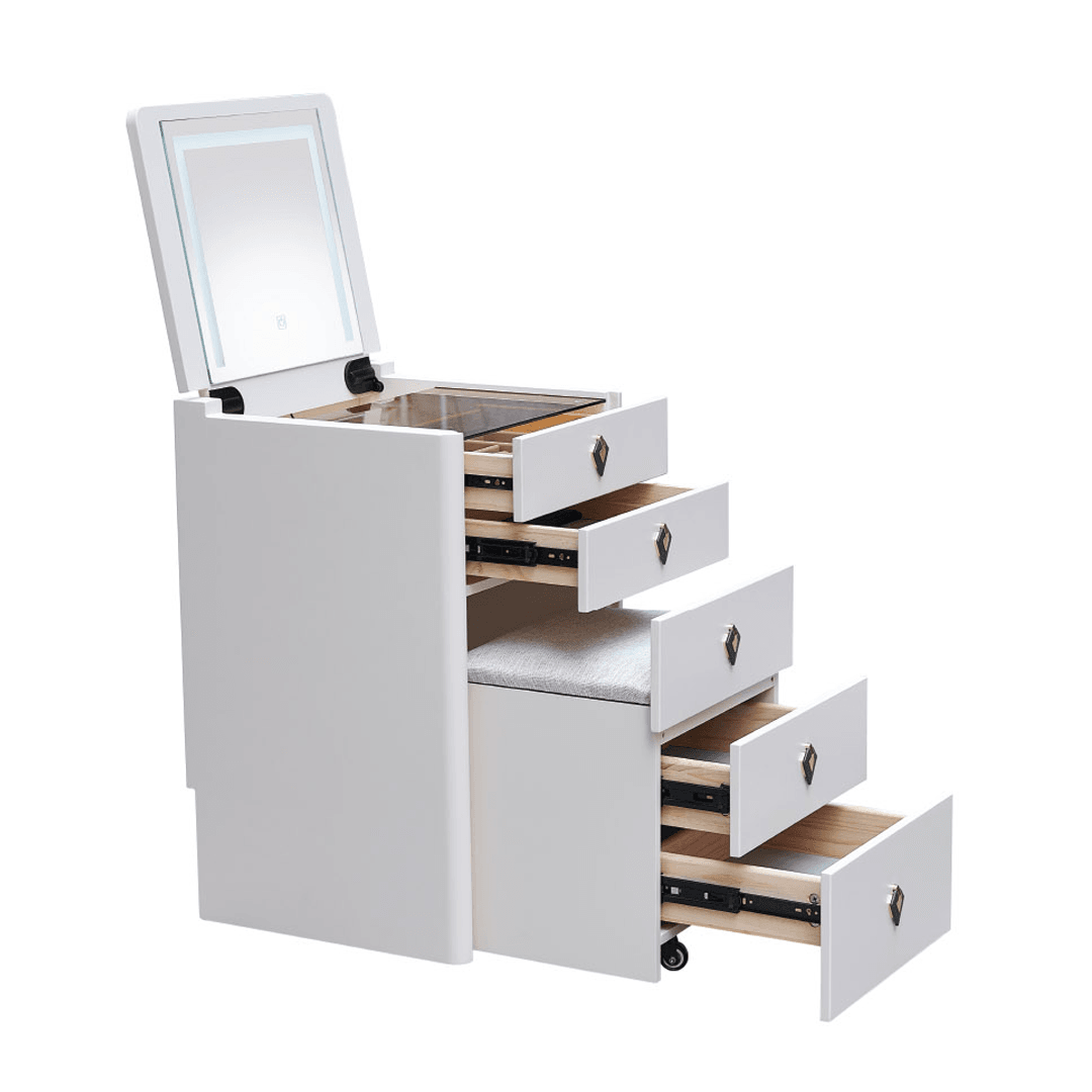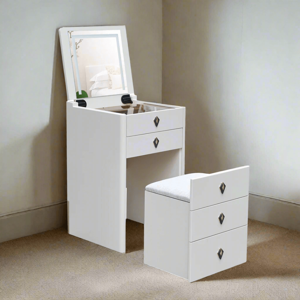 The Aquina Off White Dressing Table with Dressing Stool offers a compact design that maximizes storage space. Featuring a tri-tone LED mirror light with white, warm, and cool settings, this table also has a soft close flip top that can conceal the mirror when not in use. Included is a matching dressing stool.