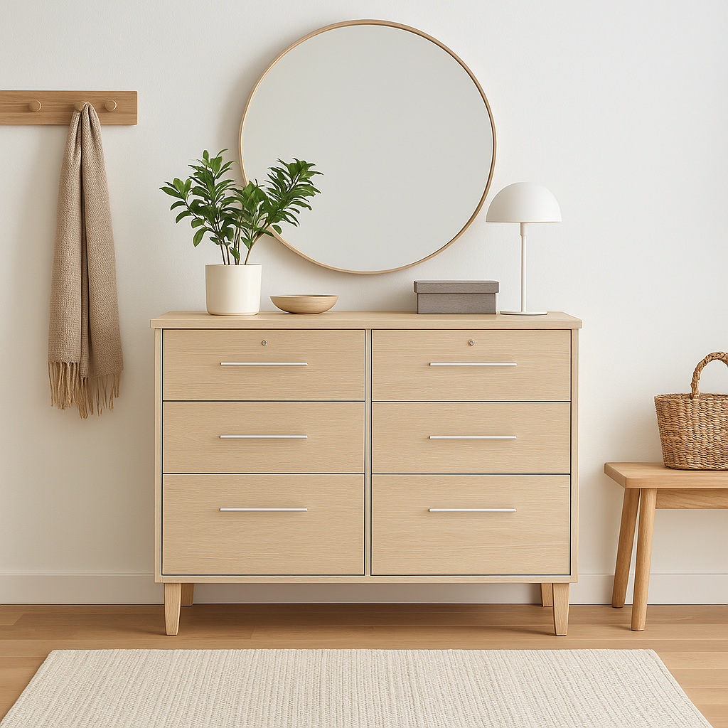 Enhance the organisation and aesthetics of your home with the Arnelle Chest of Drawer, a versatile and stylish storage solution that effortlessly fits anywhere in your home. This chest has six spacious drawers and ample storage space to keep your belongings tidy and easily accessible. So, whether you need a spot for kitchen utensils or a place to store living room essentials, the Arnelle Chest of Drawers has you covered.