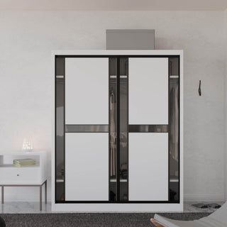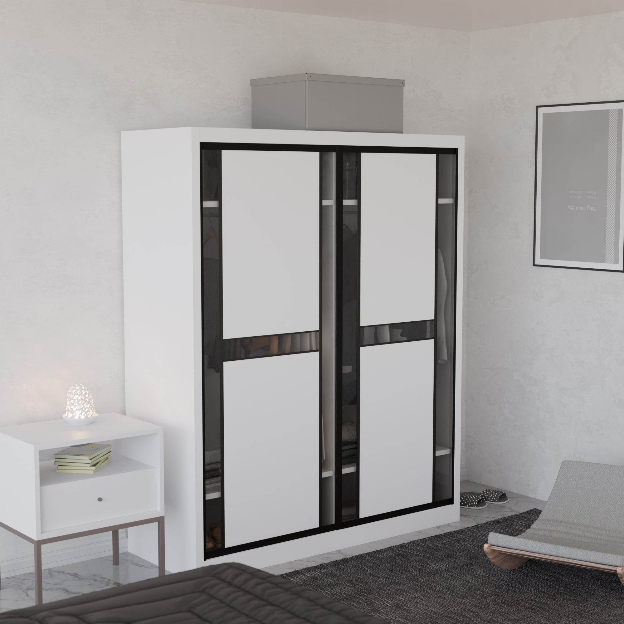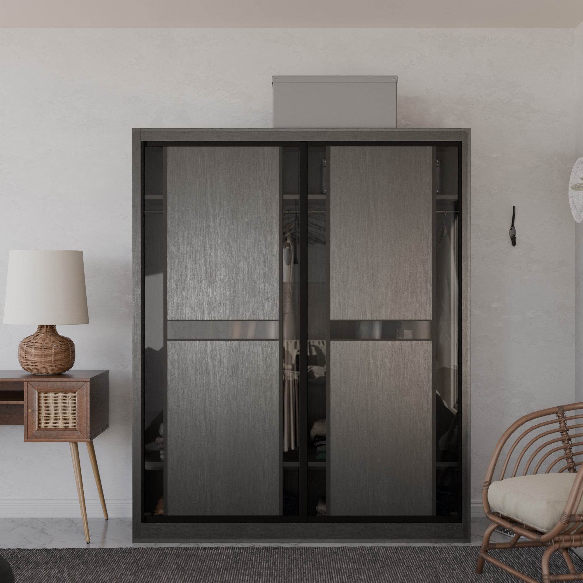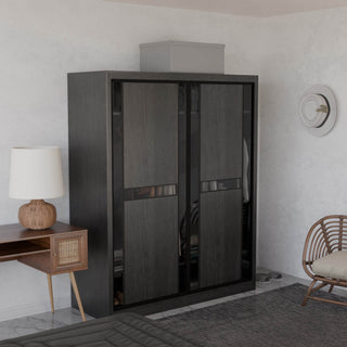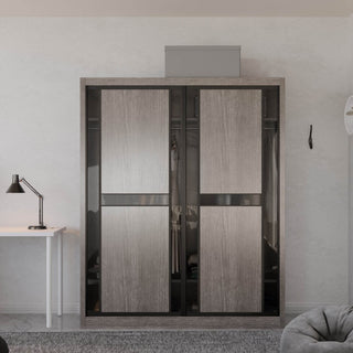 The Becca Modular Wardrobe frame is constructed with particle board frame, with a plywood backing and laminate finish. The doors are made of wooden laminate that slides on a smooth sliding door track system.