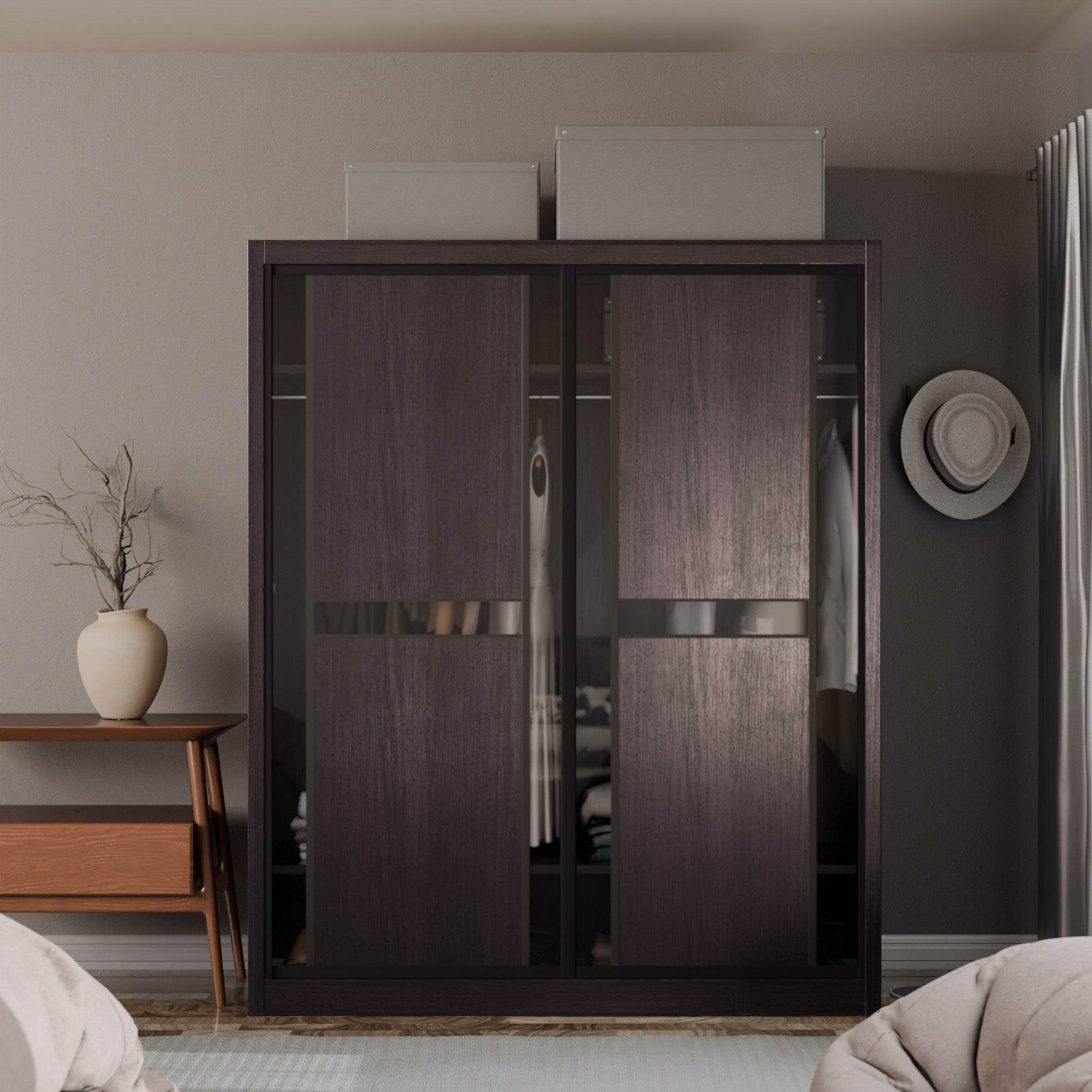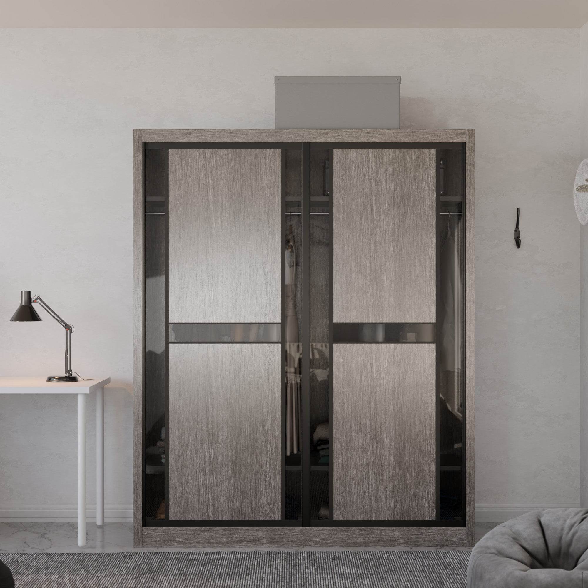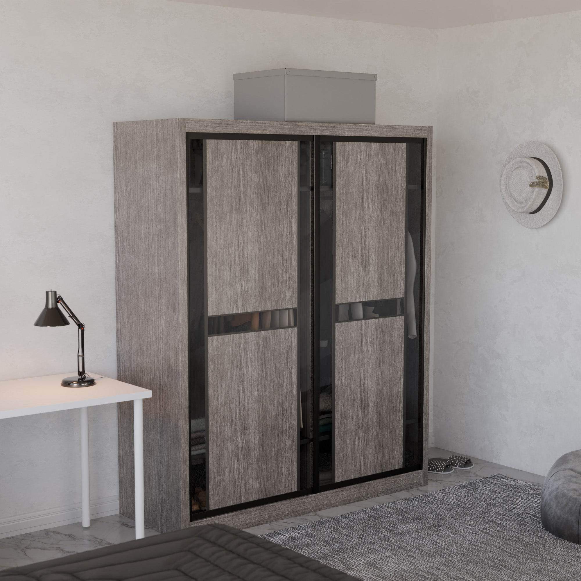 The Becca Modular Wardrobe frame is constructed with particle board frame, with a plywood backing and laminate finish. The doors are made of wooden laminate that slides on a smooth sliding door track system.