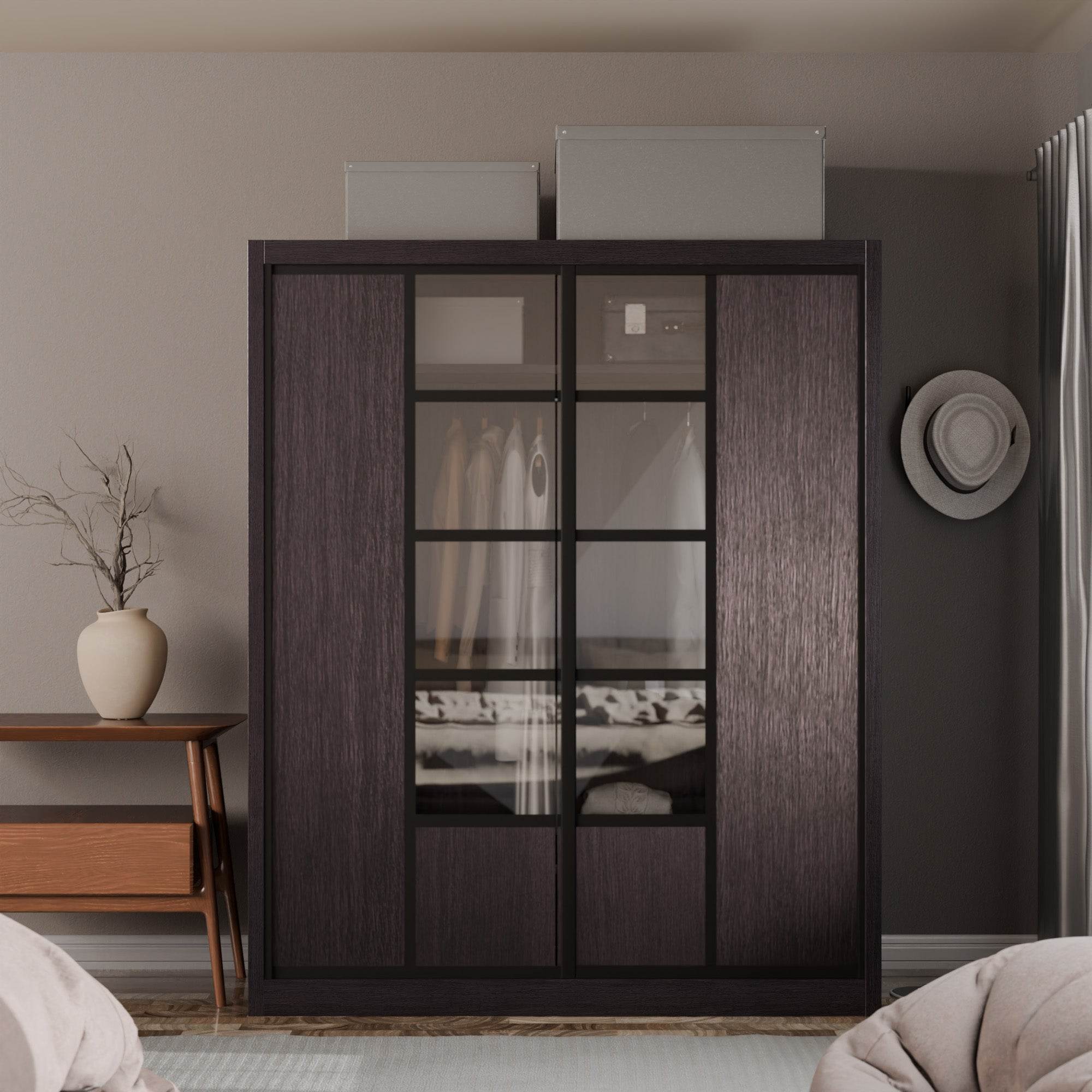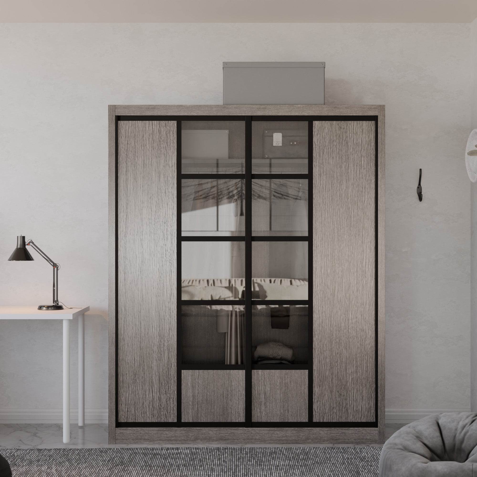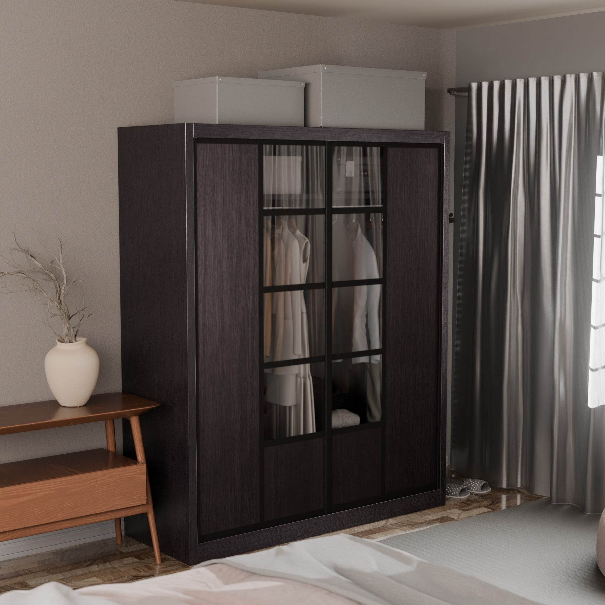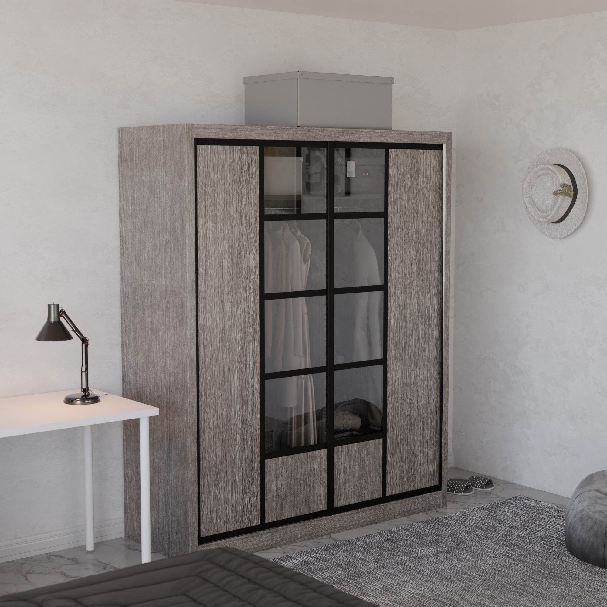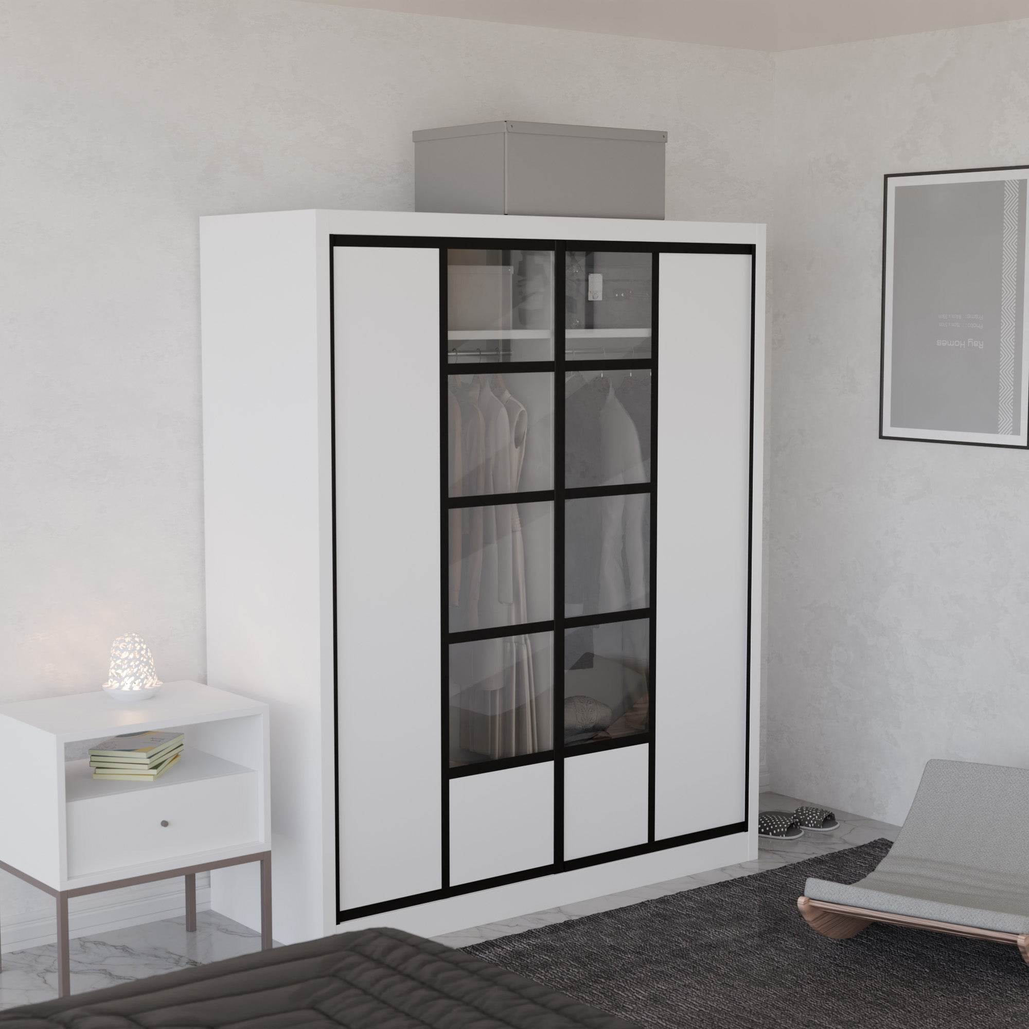 The Becca Modular Wardrobe frame is constructed with particle board frame, with a plywood backing and laminate finish. The doors are made of wooden laminate that slides on a smooth sliding door track system.