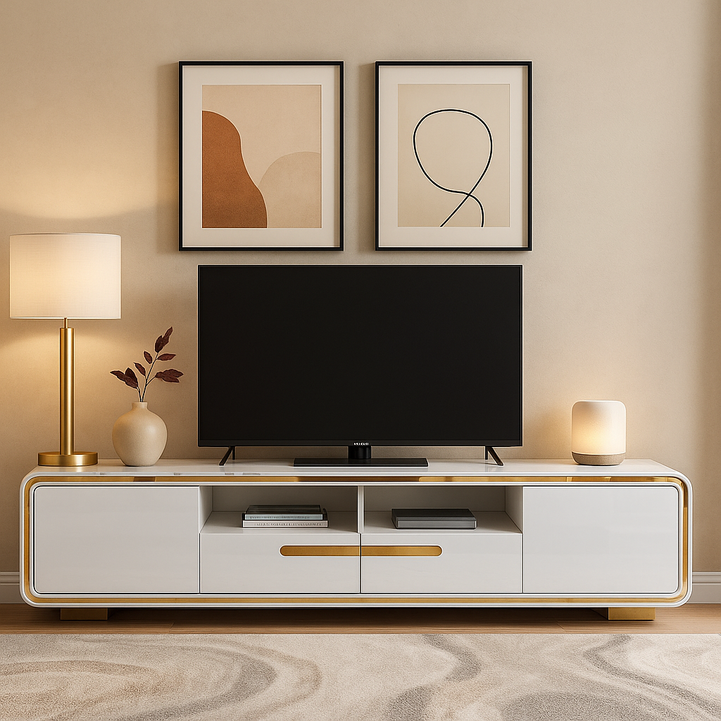 Elevate your living space with the Carlen Gloss White TV Console. Crafted with durability in mind, this sleek piece features tempered glass shelves and a pristine white gloss finish. Perfect for organising your entertainment essentials, its minimalist design effortlessly complements any modern interior. Enhance your home environment with this stylish addition, seamlessly blending functionality with contemporary aesthetics.