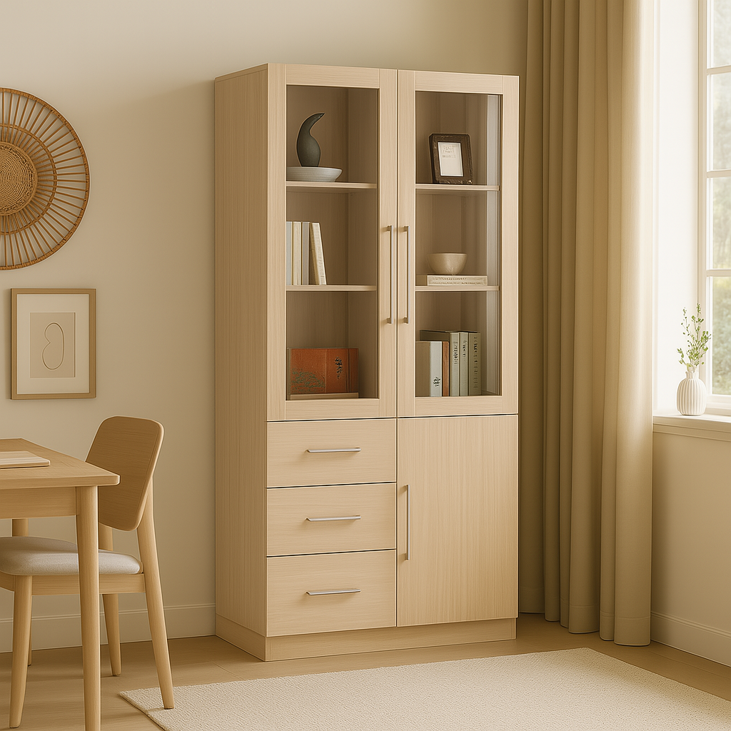 And here's another cool feature – a drawer with a lock! It is perfect for keeping your special stuff safe and sound. Its aluminium handles add that modern touch, and you can pick from cherry, walnut, or maple finishes – nice, right?