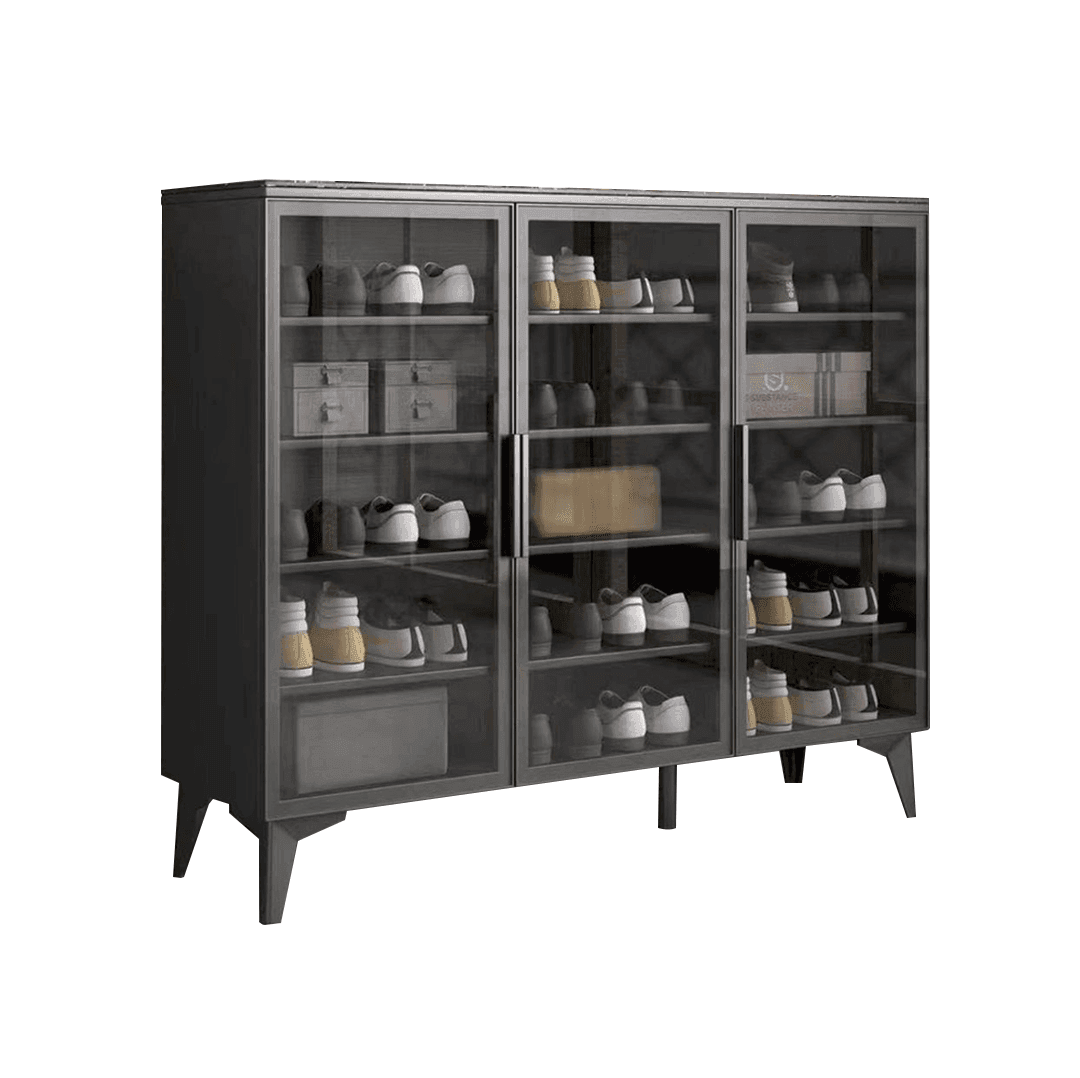 The Coda Sintered Stone 3-Door Shoe Cabinet is your sleek, chic solution to your shoe dilemma. The top is crafted from durable sintered stone, perfect for knick-knacks or a stylish vase. It screams sophistication with a classy black finish and three soft-closing tempered glass doors. Inside, five layers of shelves await your shoe collection. And those chrome metal legs add just the right amount of bling.