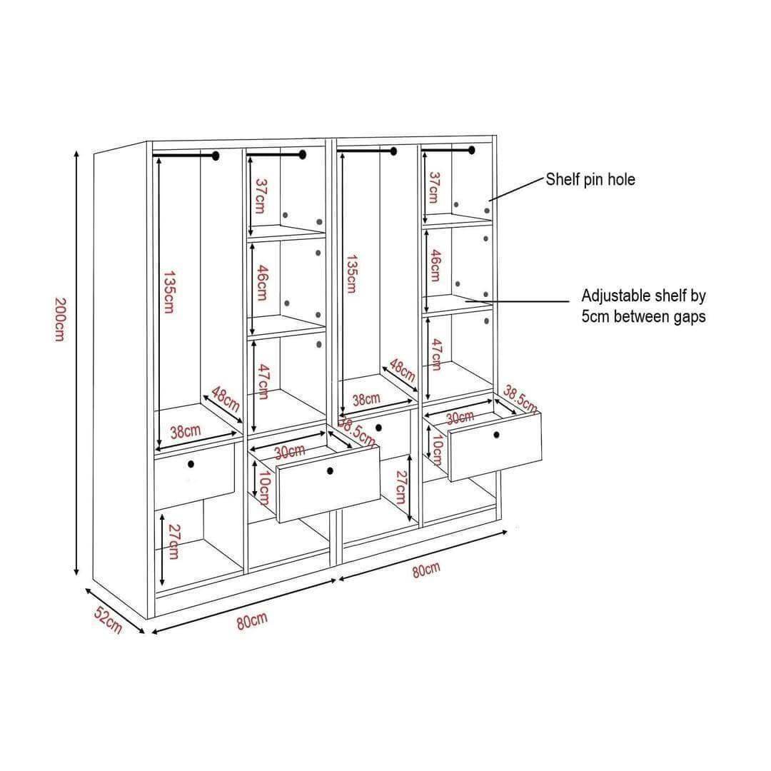 Designed to meet the diverse storage needs of modern living, the Darragh Mirror 4 Open Door Wardrobe offers ample space to organise and display your wardrobe essentials. With four generously sized open doors, accessing your belongings is effortless, making your daily routine more convenient. Plus, including mirror on one of its doors creating a sense of spaciousness and brightness, making even small rooms feel more expansive.