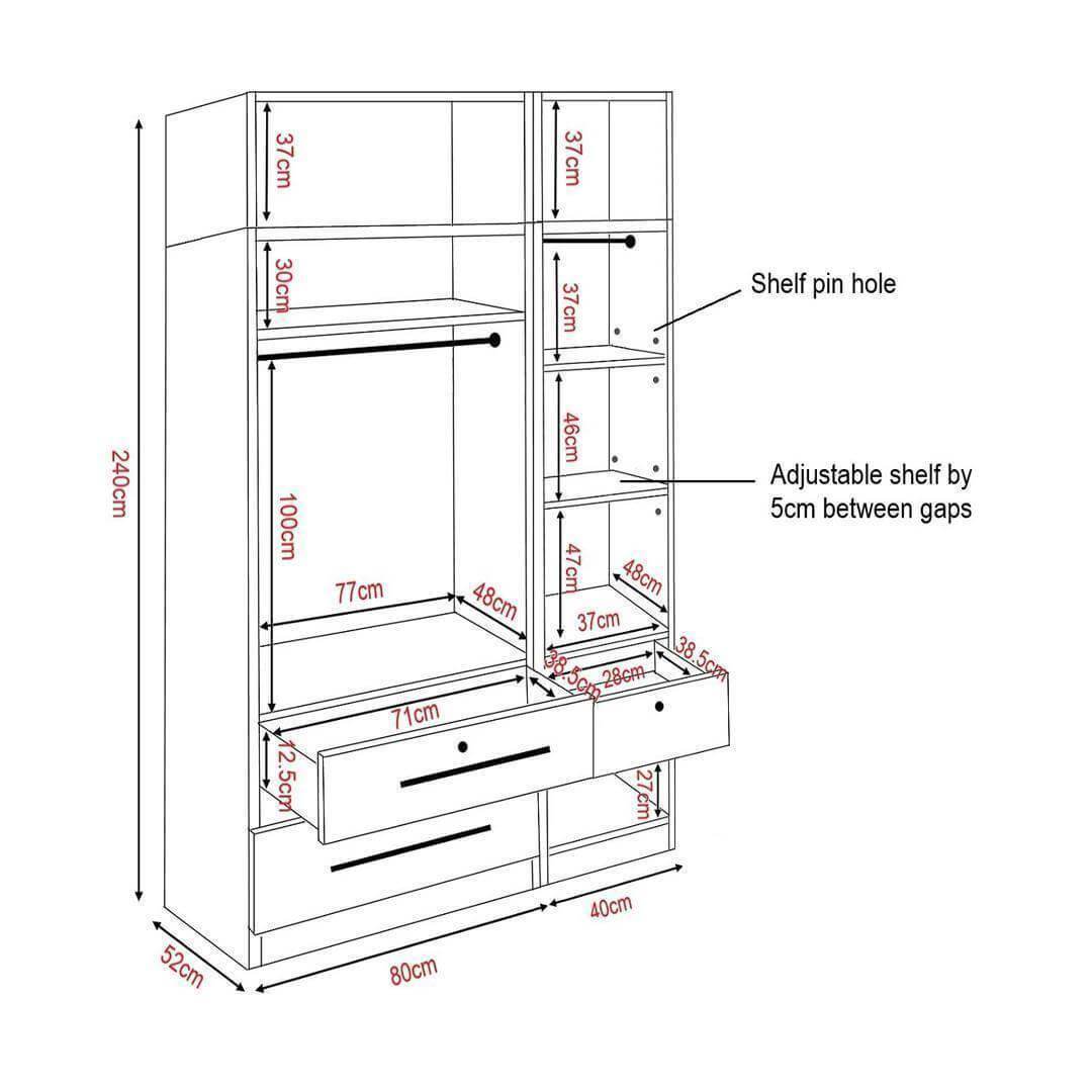 Deverac 3 Open Door Wardrobe with Drawers & Top presents quality and beauty in one reliable furniture unit. This elegant wardrobe boasts a cosy modern look and functional interior. It offers a combination of open door shelves, adjustable shelves, and pull out drawers for a versatile storage solution. Keep your hanged and folded clothes and linens in one secured wardrobe. Available in cherry, walnut, and maple colours.