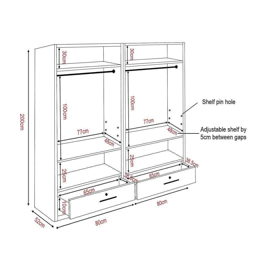 Featuring an open-door concept, the Deverel 4 Open Door Wardrobe offers a modern twist on traditional wardrobes, providing easy access to your clothing and accessories while enhancing the overall aesthetic of your bedroom. It has a spacious interior that provide ample room to organise your wardrobe essentials, from clothing and shoes to bags and accessories, keeping your belongings neatly arranged and easily accessible.