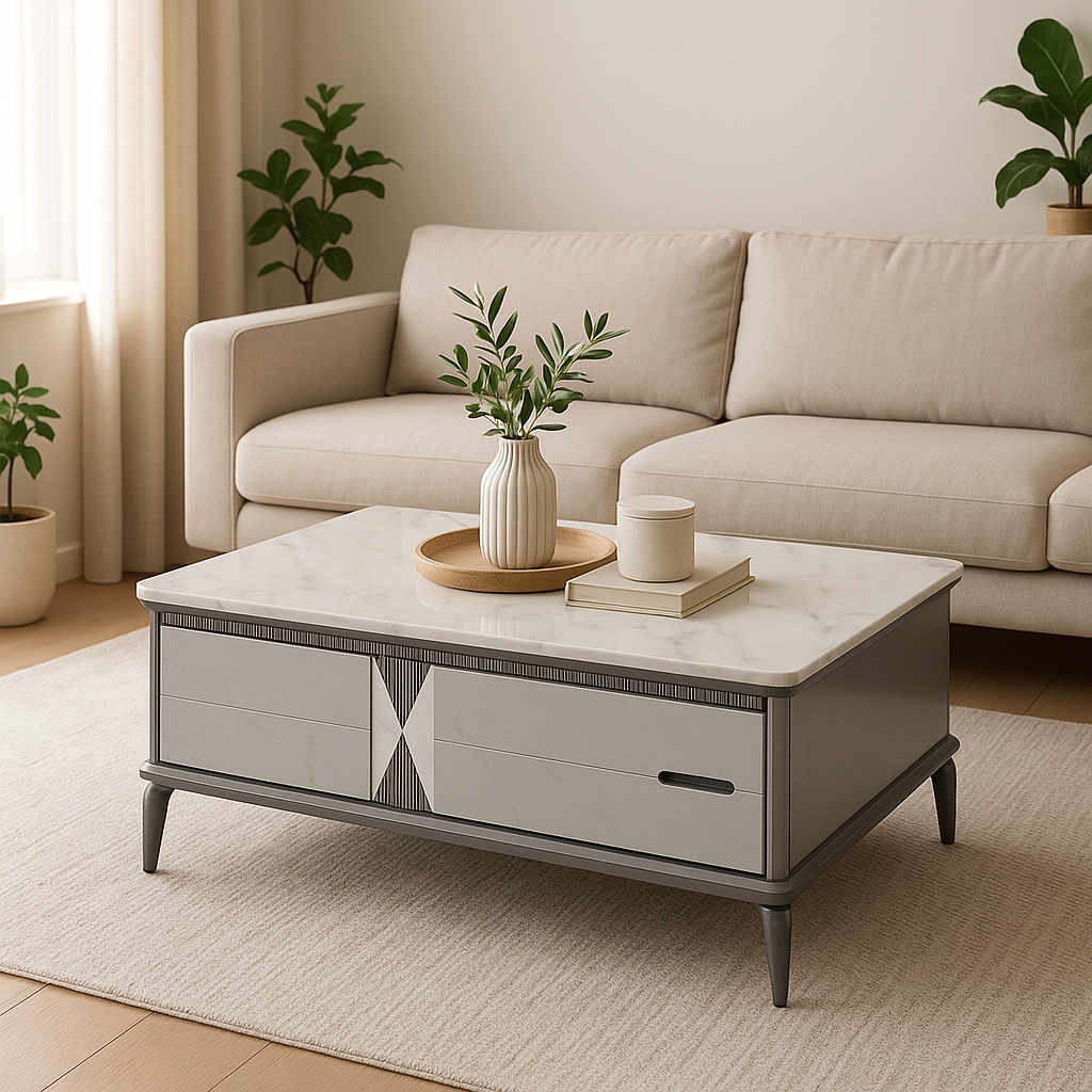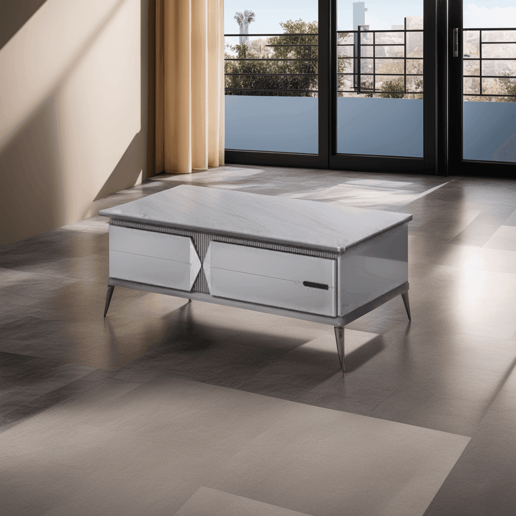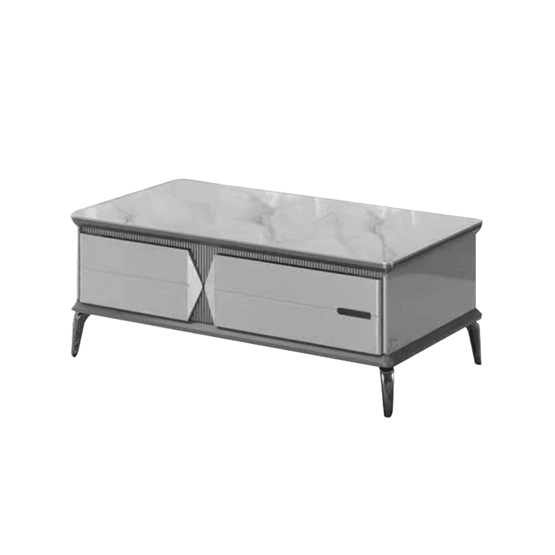 If you love a clean, modern look but need practicality too, the Dolores Glossy Sintered Stone Coffee Table is right for you. Its glossy sintered stone top is not just a pretty face – it’s super easy to clean (bye-bye, stubborn coffee rings!) and durable enough for daily use. And guess what? There’s a soft-closing drawer – perfect for tucking away those little things that always seem to clutter up your space. The MDF structure with a grey finish gives it a sleek, contemporary vibe, while the metal legs add a touch of industrial chic.