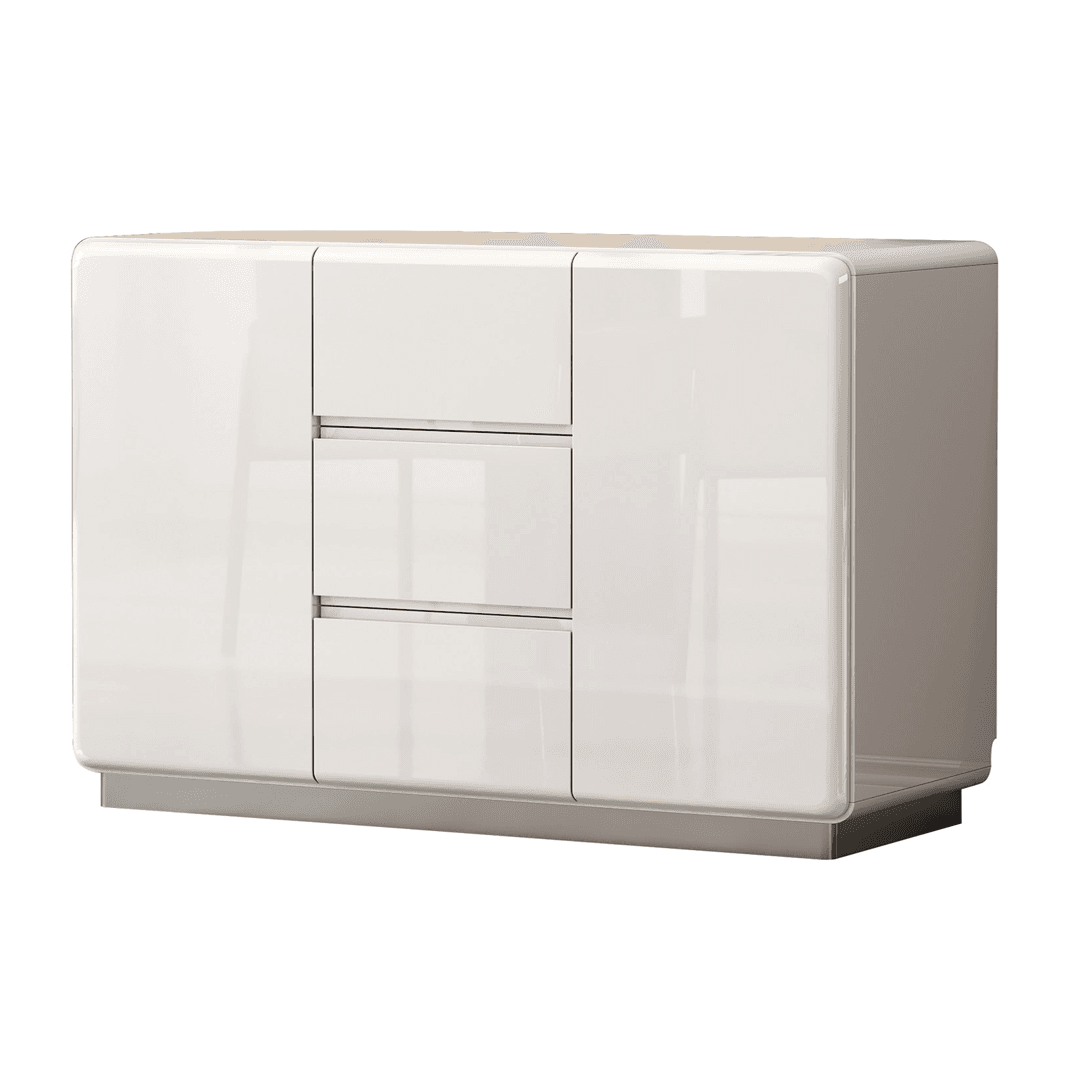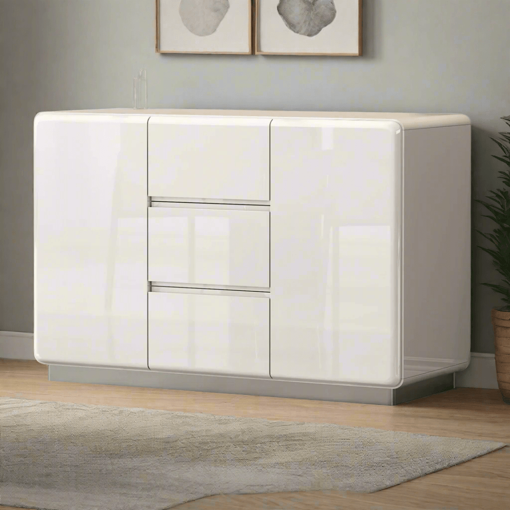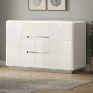 Transform your dining room into a sophisticated oasis with the addition of the Estrella White Sideboard (120cm). Its sleek gloss finish and rounded edges exude elegance and durability, making it the perfect complement to any space without overpowering it.