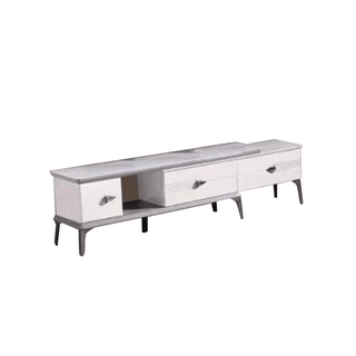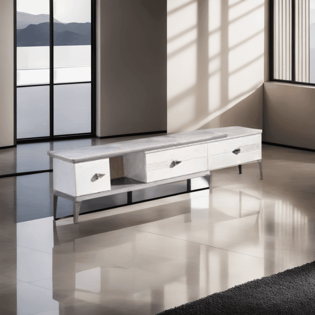 Enhance your home entertainment setup with the Etta II Extendable TV Console with Glossy White Jade Stone Top. Its glossy white jade stone top exudes elegance, complemented by a sturdy MDF structure with a white finish and sleek metal legs. With three soft-closing drawers and the ability to extend up to 200cm, it offers practicality without compromising style. Elevate your living space with this versatile and sophisticated addition.