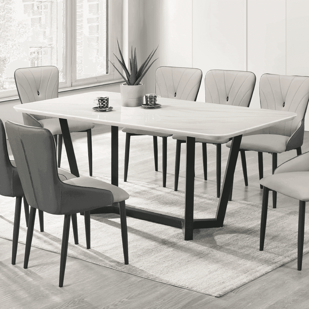 Experience the thrill of boldness with the Fiorella Marble Dining Set (1+8). Crafted from lavish cultured marble, this table brings elegance to any dining area. Dare to elevate your dining experience with this captivating centerpiece! Accompanied by 8 sophisticated faux leather dining chairs for a cozy meal time at home.