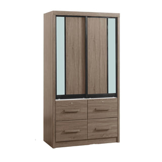 Bring a sense of order and contemporary flair to your bedroom with the Gareth 4ft Brown Wardrobe, a statement piece that effortlessly balances simplicity and sophistication for a truly refined living experience. Made from high-quality materials, this wardrobe features smooth sliding doors that conserve space and give elegance to your room. Inside, you'll find a well-organised storage system designed to meet your diverse needs with its ample hanging space, adjustable shelves, and convenient drawers that provide the perfect home for your clothing, accessories, and personal belongings.