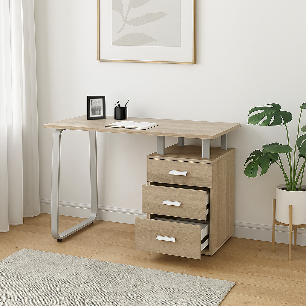 Finish your work loads with ease with Gryman Study Table. This table offers a spacious tabletop and ample pull-out drawers to keep your workspace clean and organised. This compact study and office table can fit even to small rooms.