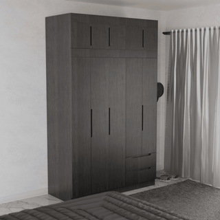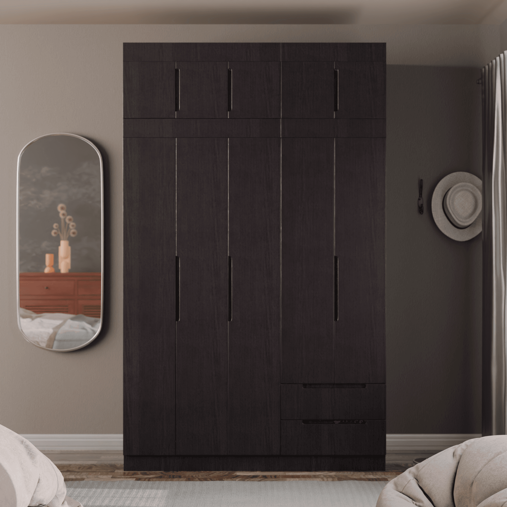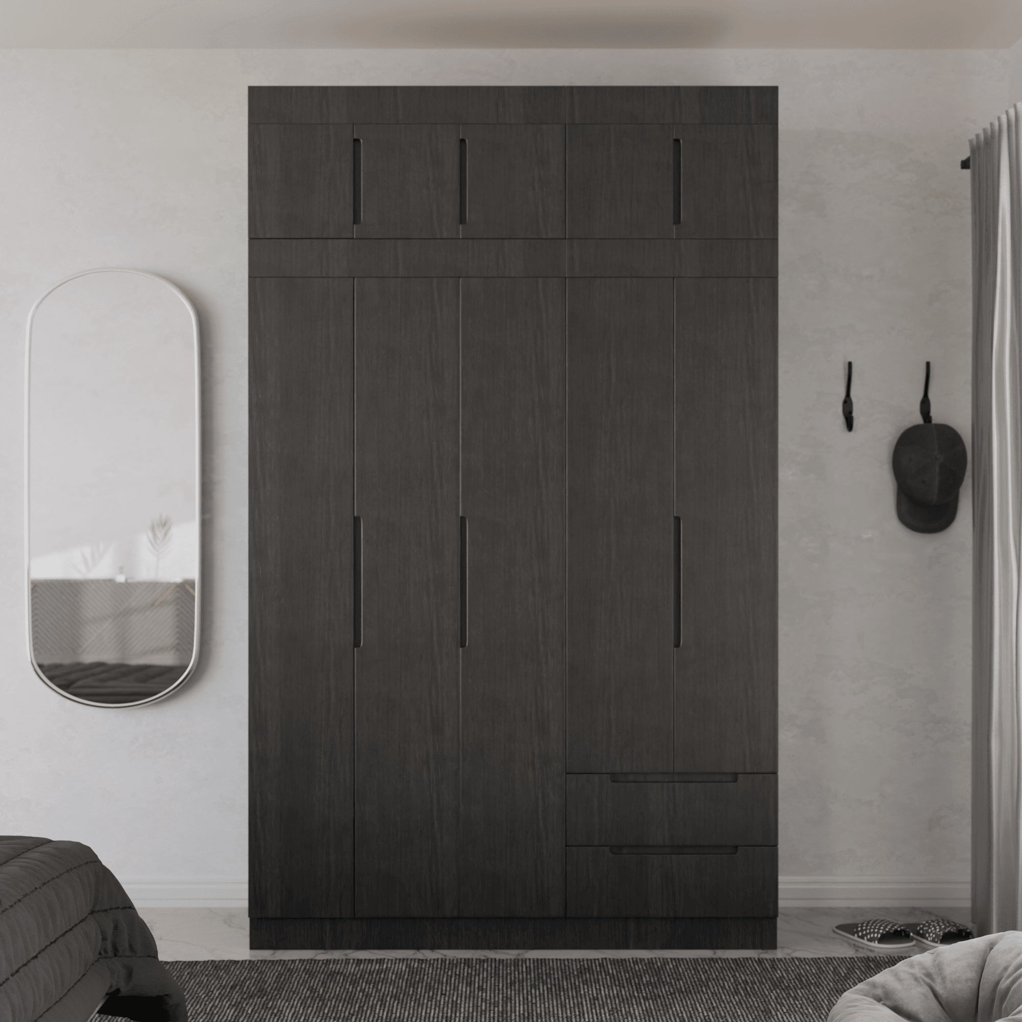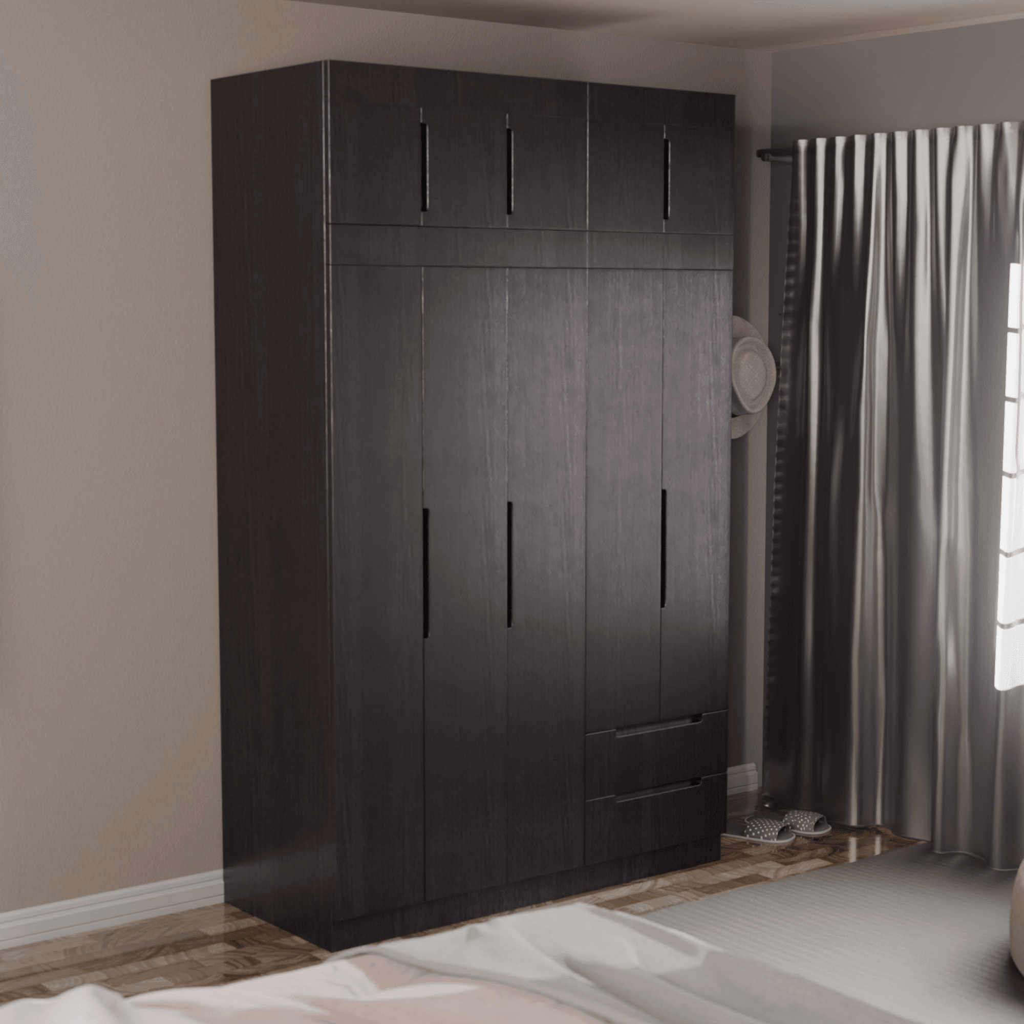 Experience the elegance of the Harrison 5 Door Open Wardrobe with Top. Crafted in solid plywood with sleek black iron handles, the wardrobe features soft closing hinged doors, two drawers, one internal drawer and three clothes rods for extra storage on top. Unbeatable style for your home!