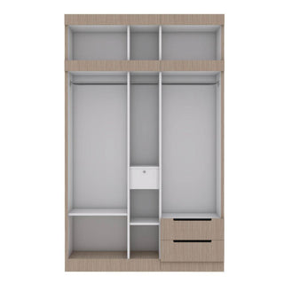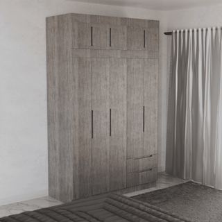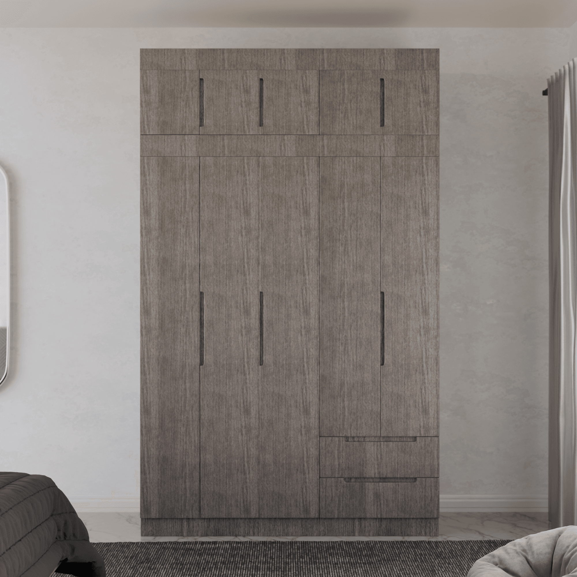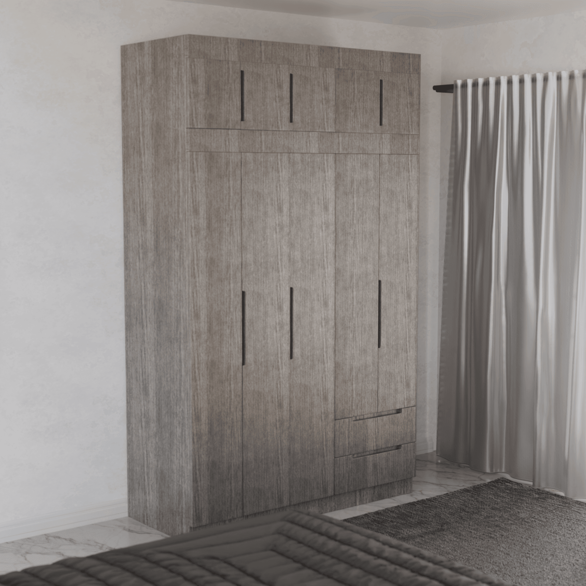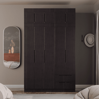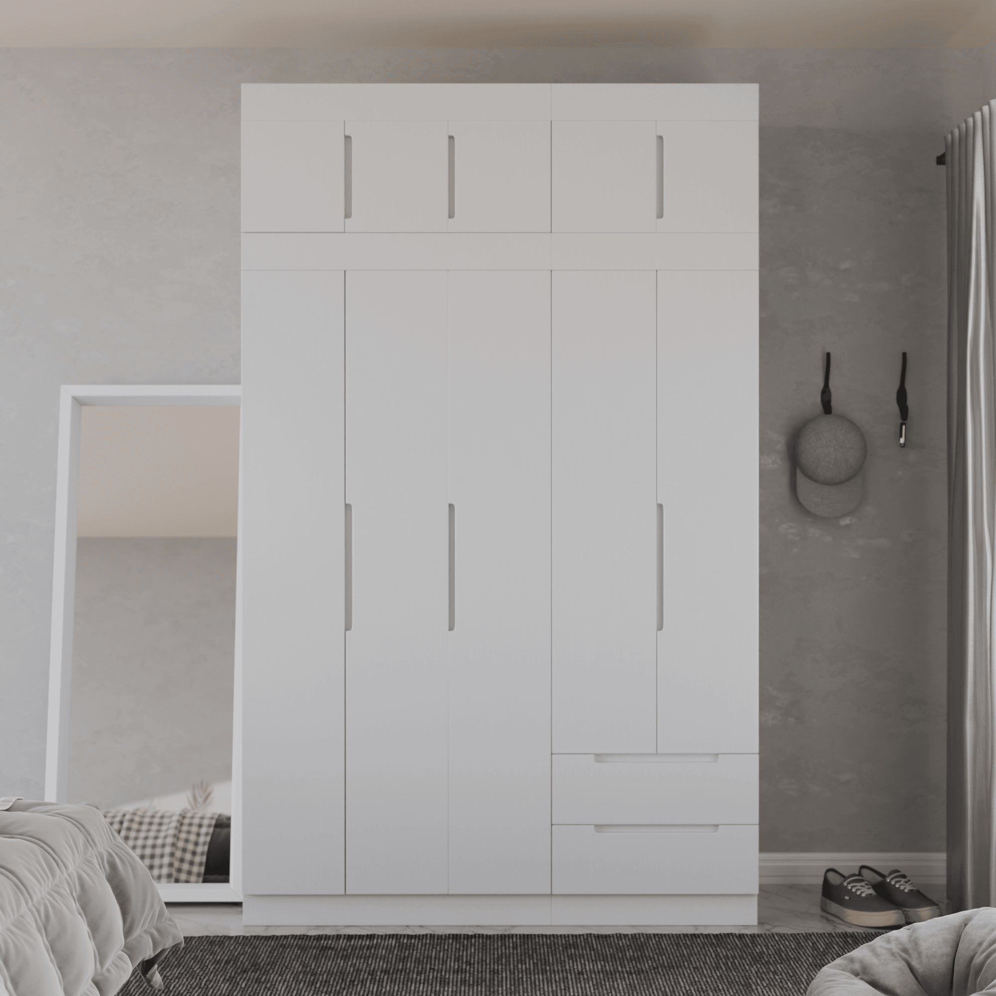 Experience the elegance of the Harrison 5 Door Open Wardrobe with Top. Crafted in solid plywood with sleek black iron handles, the wardrobe features soft closing hinged doors, two drawers, one internal drawer and three clothes rods for extra storage on top. Unbeatable style for your home!