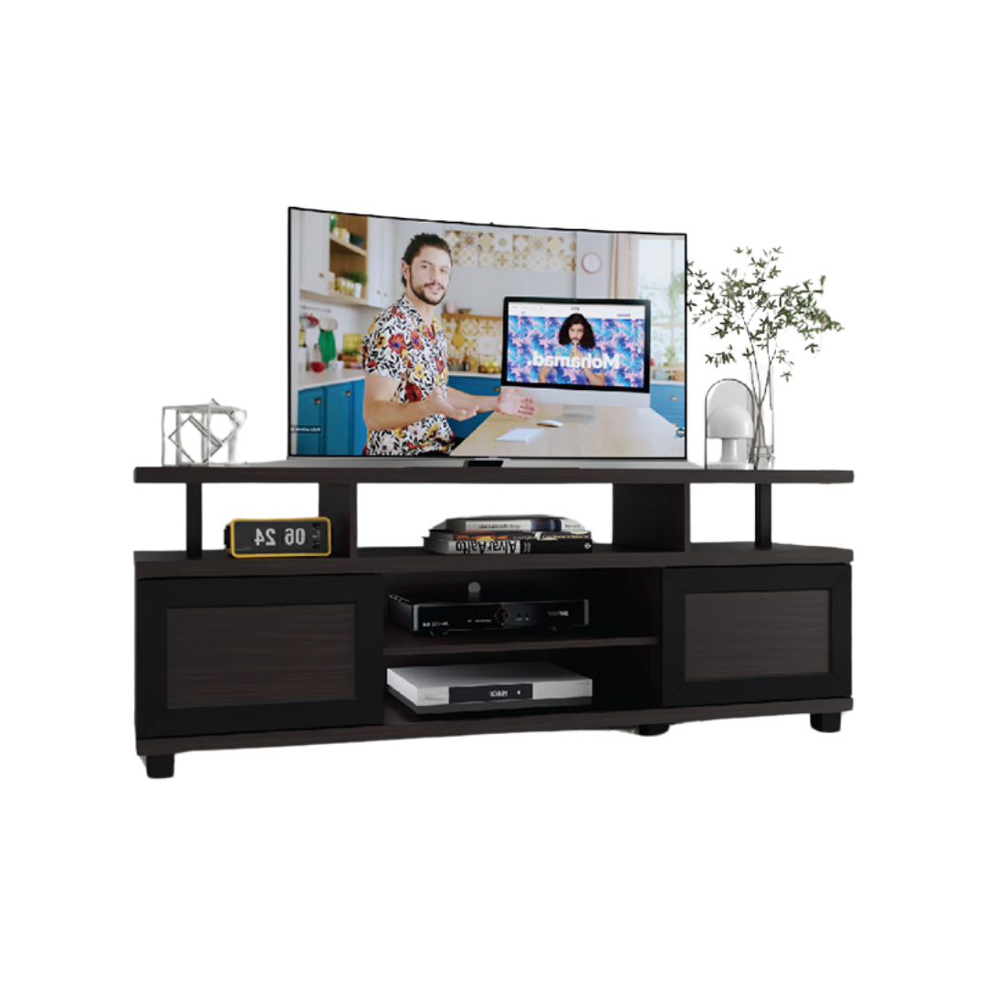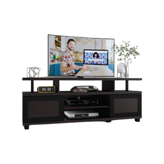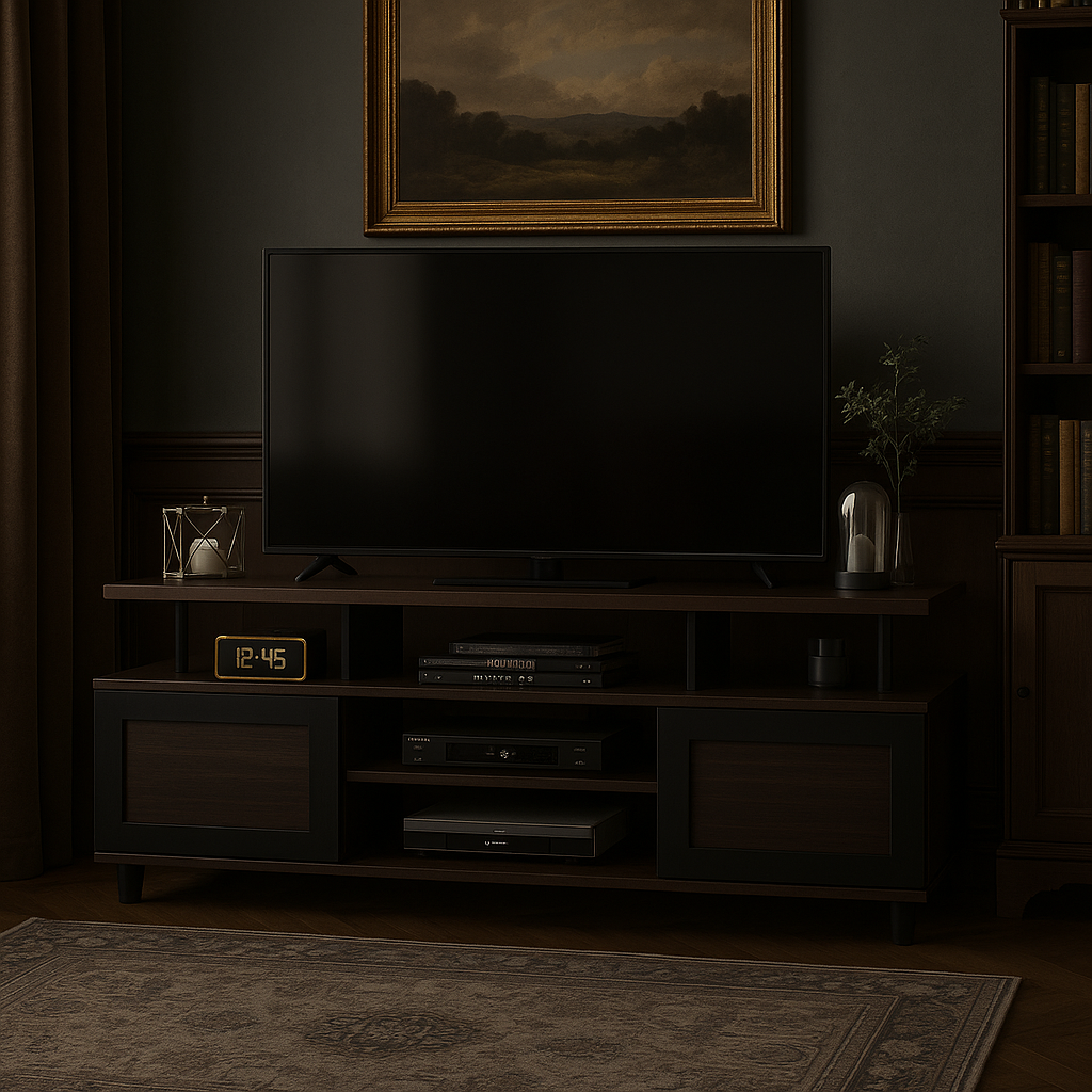 The Jareth Wooden TV Console blends timeless design with modern functionality, creating a refined focal point in your living space. Crafted from high-quality particle board, it features a deep walnut woodgrain finish that contrasts beautifully with the sleek black door frames—perfect for dark academia or modern interior themes.