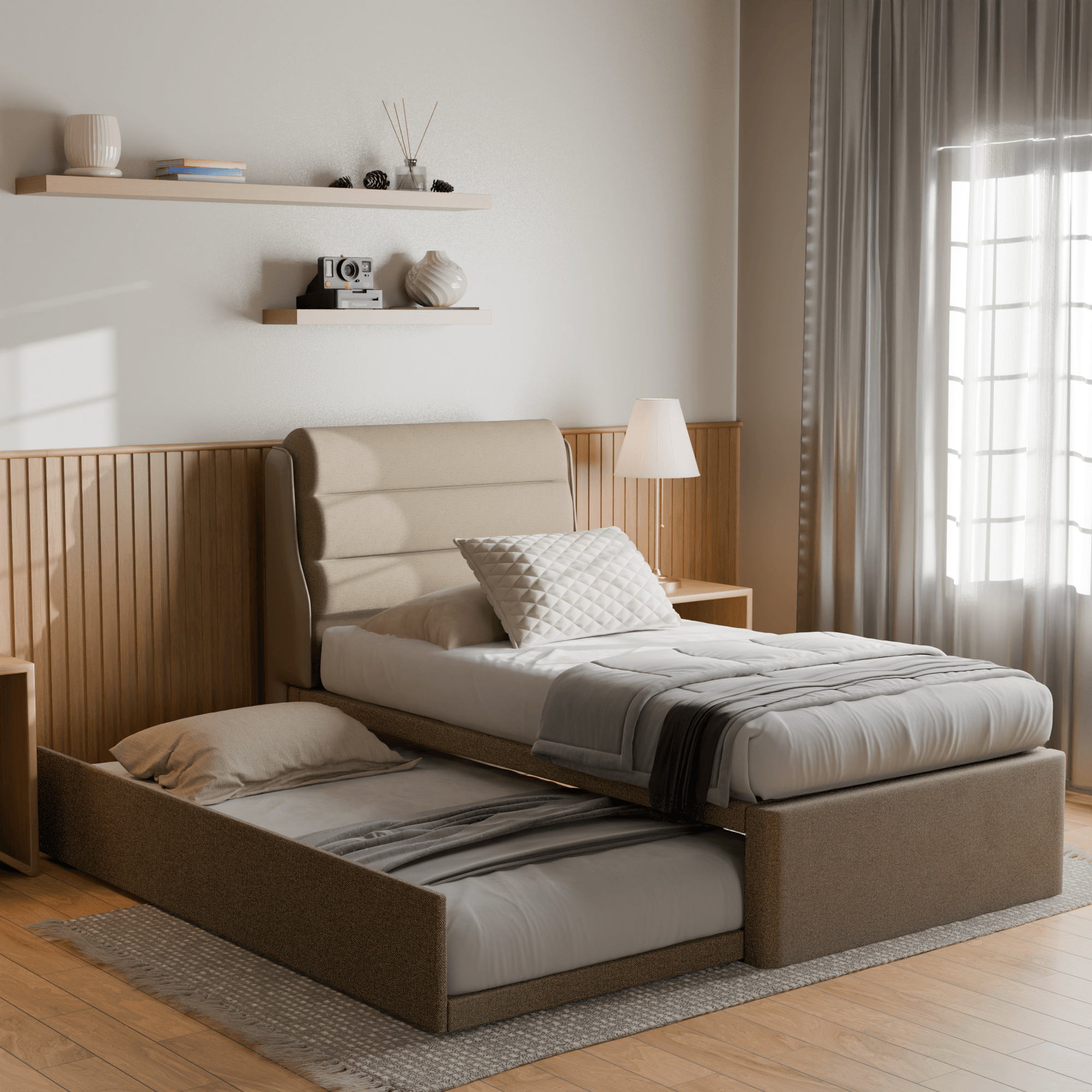 Trundle beds are some of the best solutions to maximise the use of your room. Ideal for guest rooms or shared rooms, this 3 in 1 fabric bed will definitely help you make the most out of your limited space. Made with high-quality fabric, carefully assembled frame, and cushioned headboard.