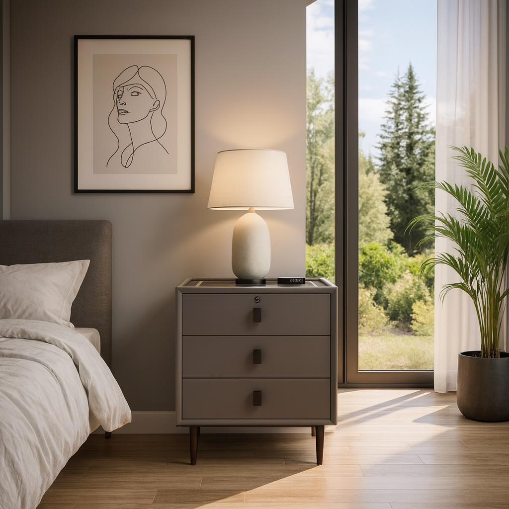 Experience the convenience of modern technology with the Jennison Bedside Table, where functionality meets style for a seamless bedside experience. With a built-in LED light on the tabletop, you can easily create a cosy atmosphere or enjoy some bedtime reading while the top surface of the table features a wireless handphone charger, eliminating the need for cords and keeping your devices powered up. But the innovation doesn’t stop there – this bedside table also boasts a high-quality speaker on the sides, allowing you to enjoy your favourite tunes or podcasts without additional devices.