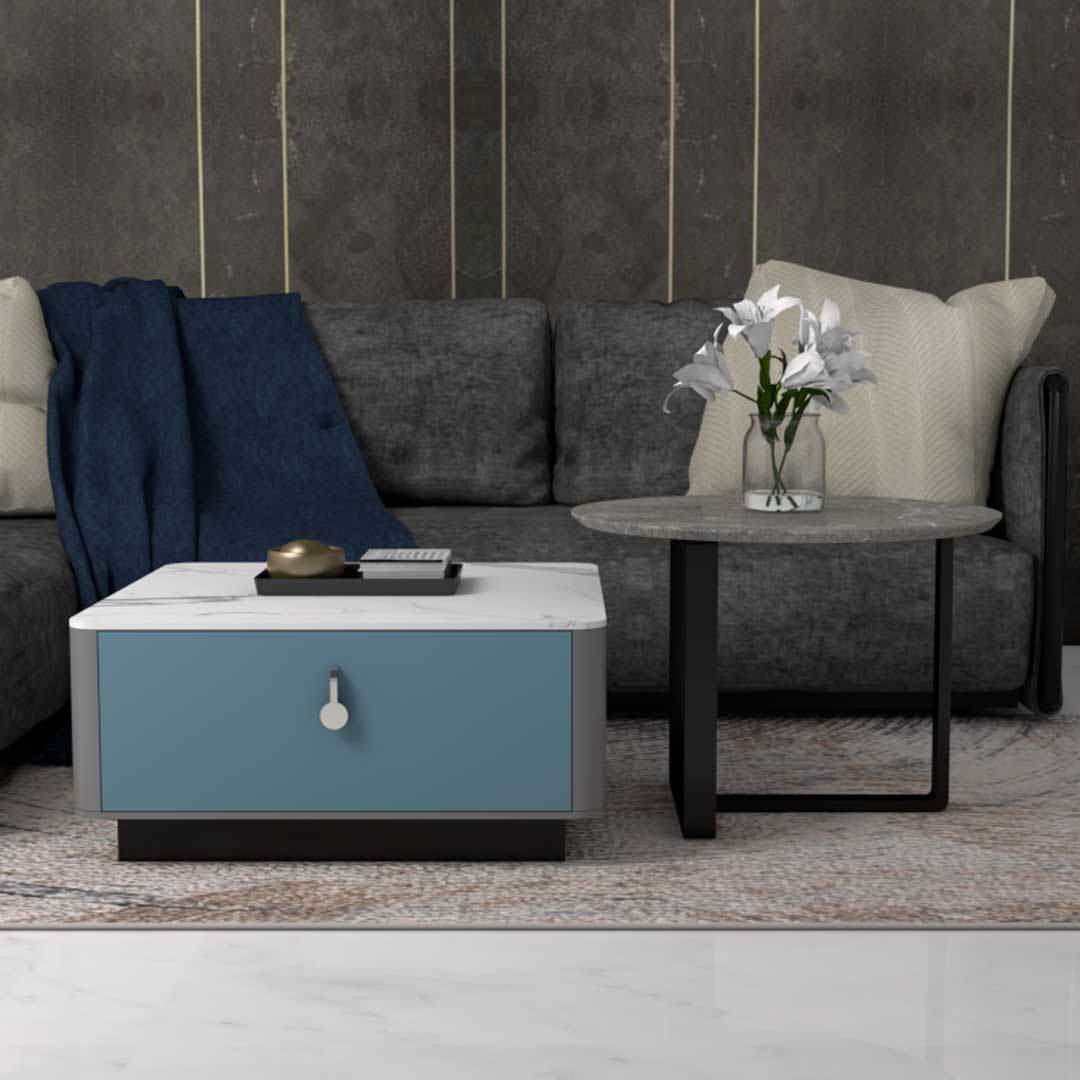 This stone coffee table has modern and durable features that spruce up any living space.