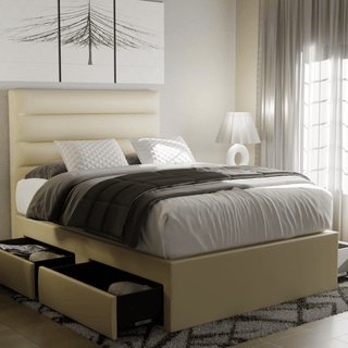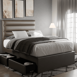 Indulge in luxury with the Keenan Faux Leather Drawer Bed. Crafted with faux leather, this elegant bed features built-in drawers for extra storage. Experience sophistication and convenience with this exclusive piece, perfect for any modern bedroom. Upgrade your sleep experience with this stylish and functional bed.