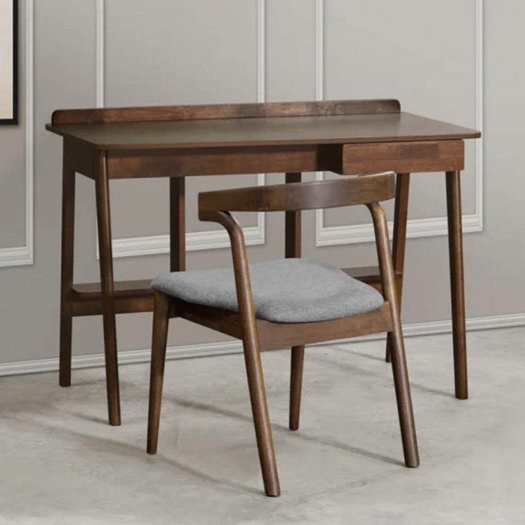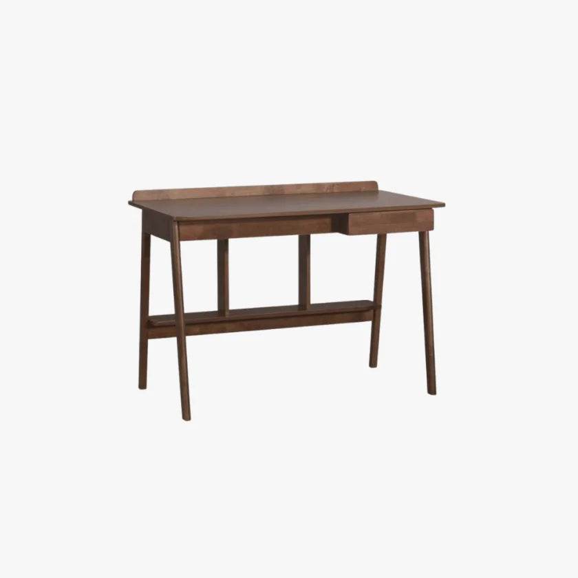 Crafted in modern Scandinavian style, the Koa Wooden Study Table features a Walnut-stained rectangular tabletop with rounded corners, plus a useful storage drawer for organising your workspace.