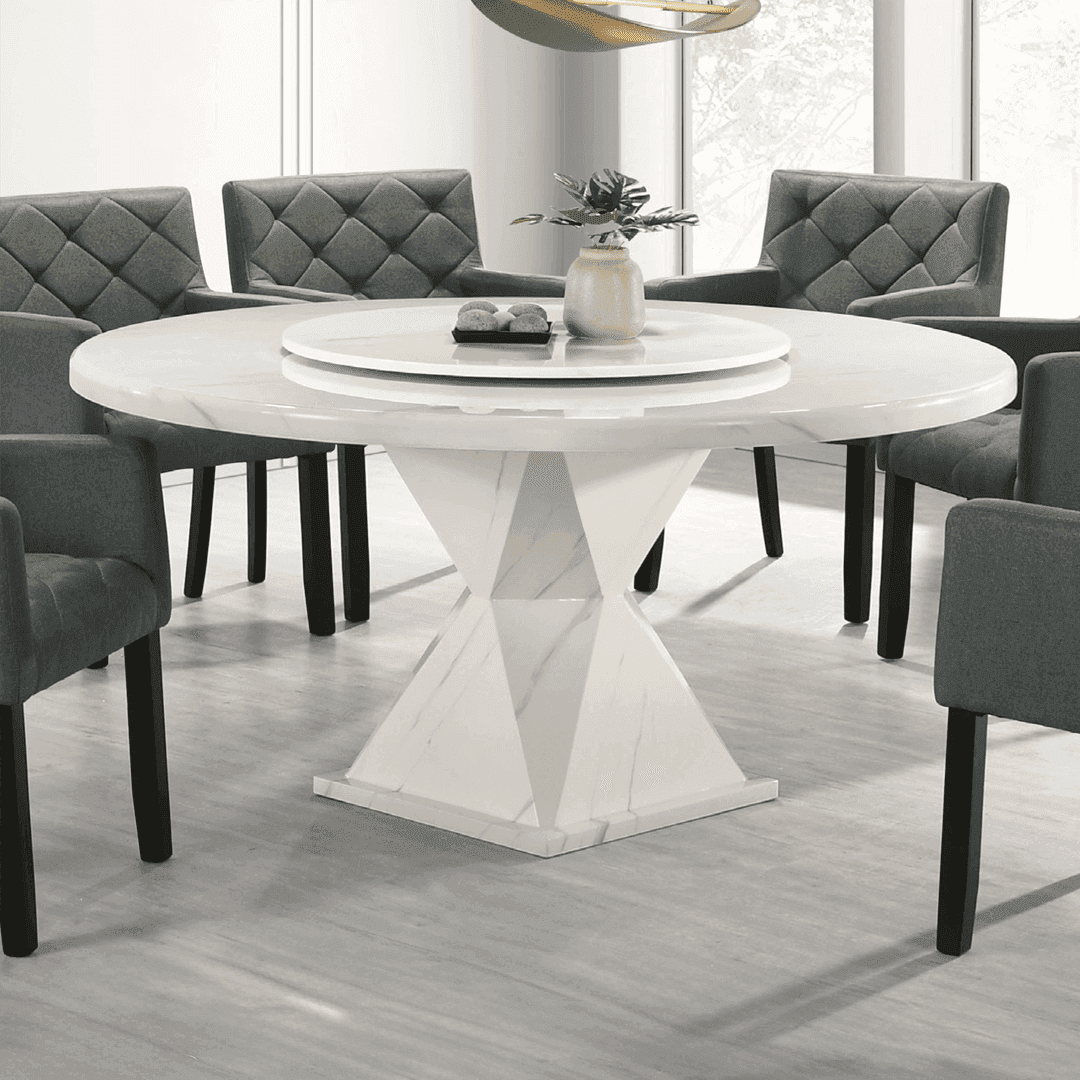 Elevate your dining experience with the Korra Round Marble Dining Table. Crafted with stunning white marble, this table is not only visually appealing but also functional with its included lazy susan. Make a statement and entertain guests in style.