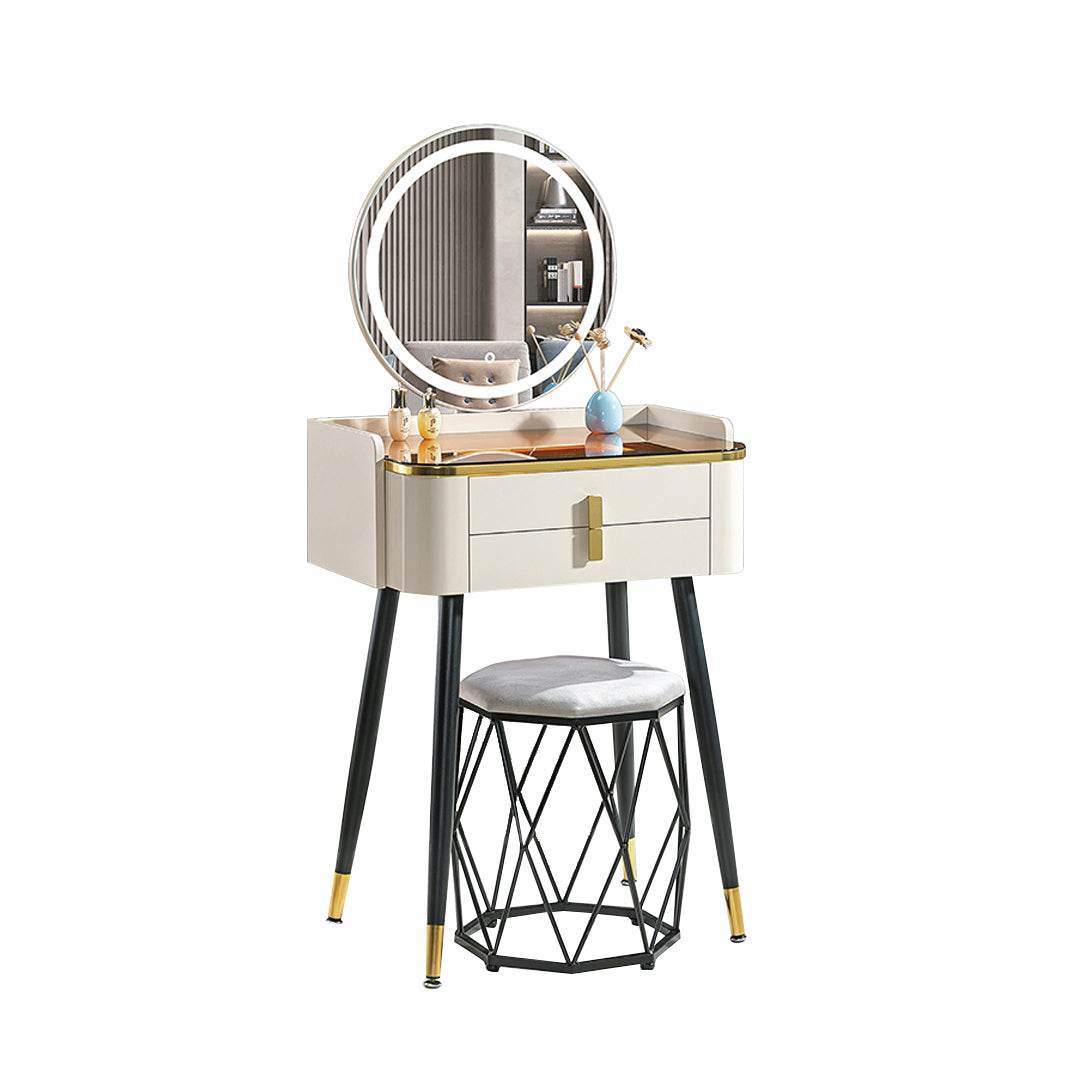 Perfect for small bedrooms, the Leander Dressing Table with Tempered Glass Top combines functionality with a sleek design to elevate your daily routine. It features a round mirror with LED lights illuminating your grooming sessions and optimal lighting for precise makeup application or skincare rituals. Plus, it comes with a modern and luxurious-looking stool with a geometric accent that offers comfortable seating while you pamper yourself in the morning.