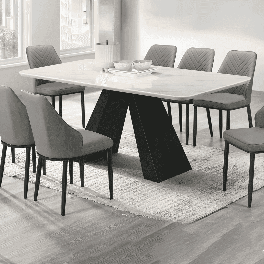 This Ludovica Marble Dining Set (1+8) boasts a cultured marble top and black powdered coated metal legs, providing a sleek and modern look that will enhance any dining area. Accompanied by 8 faux leather dining chairs, each designed for optimal comfort and long-lasting support during family meals and game nights.