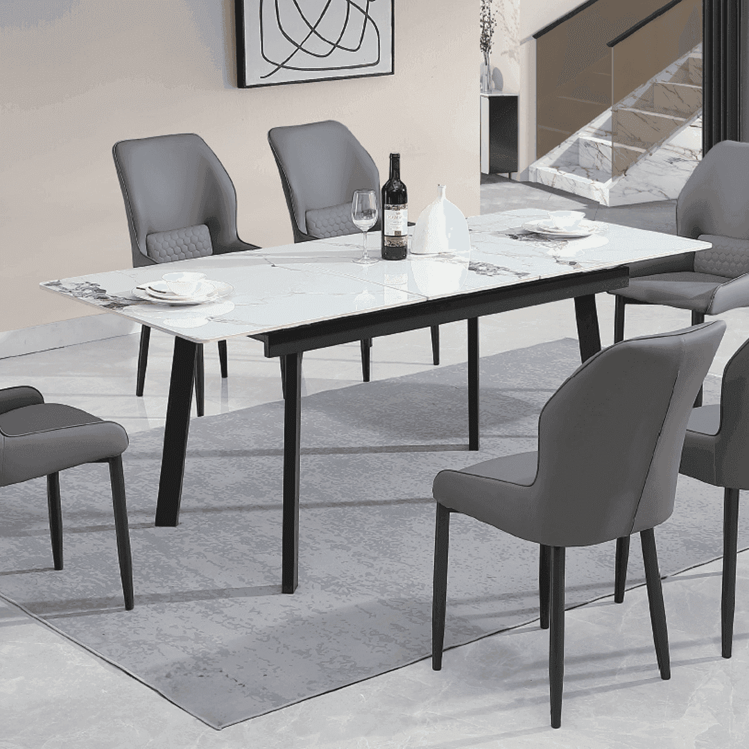 Upgrade your dining experience with the Megrez Extendable Dining Table. Made with a sintered stone table top, this table is both anti-scratch and heat-resistant, ensuring durability and longevity. Perfect for hosting gatherings and creating memories.