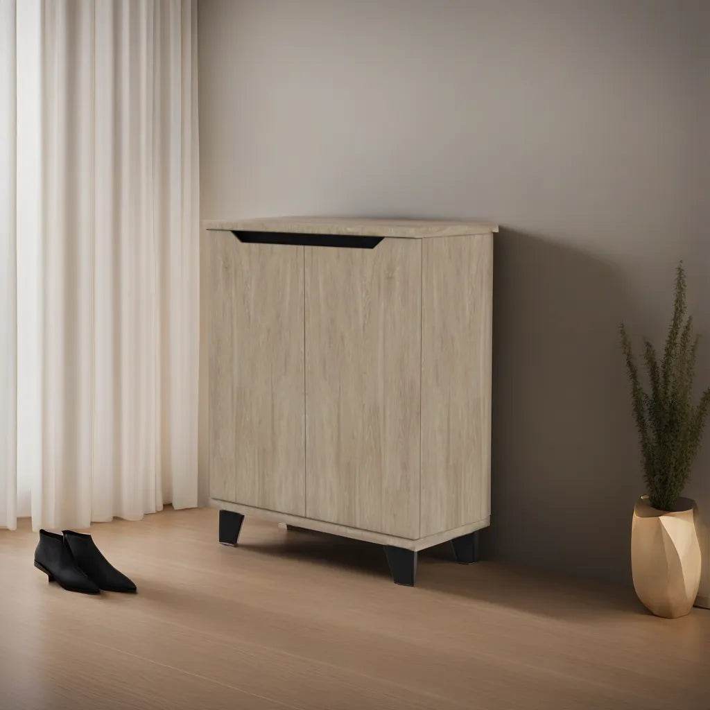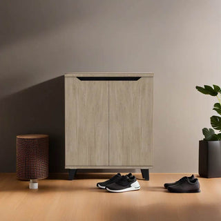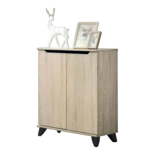 Melden 2 Door Shoe Cabinet features a natural charm with its wood material and clean design. The two-door shoe cabinet offers ample interior storage to arrange and keep your precious shoe collection. Its splayed leg design adds to its efficiency and lightweight appeal.