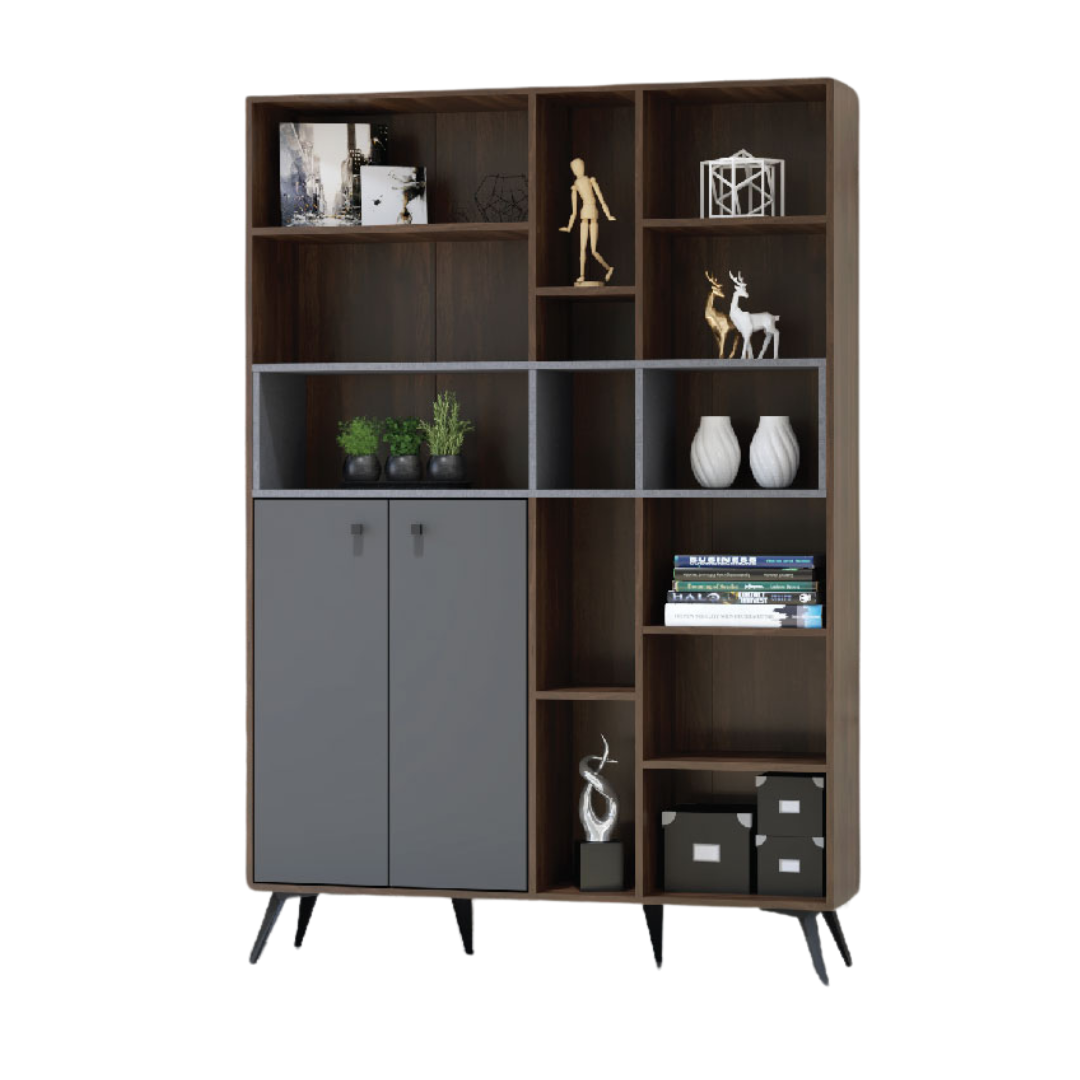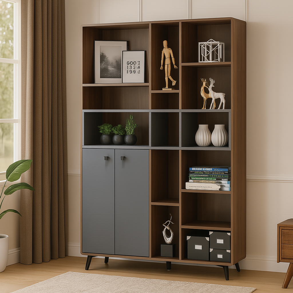 The open shelving provides ample room to display books, art, and decor, while the closed cabinet doors neatly hide away clutter. Its mid-century modern influence is highlighted by tapered legs and an elegant dual-tone finish, making it a stylish addition to contemporary study rooms, living areas, or home offices.