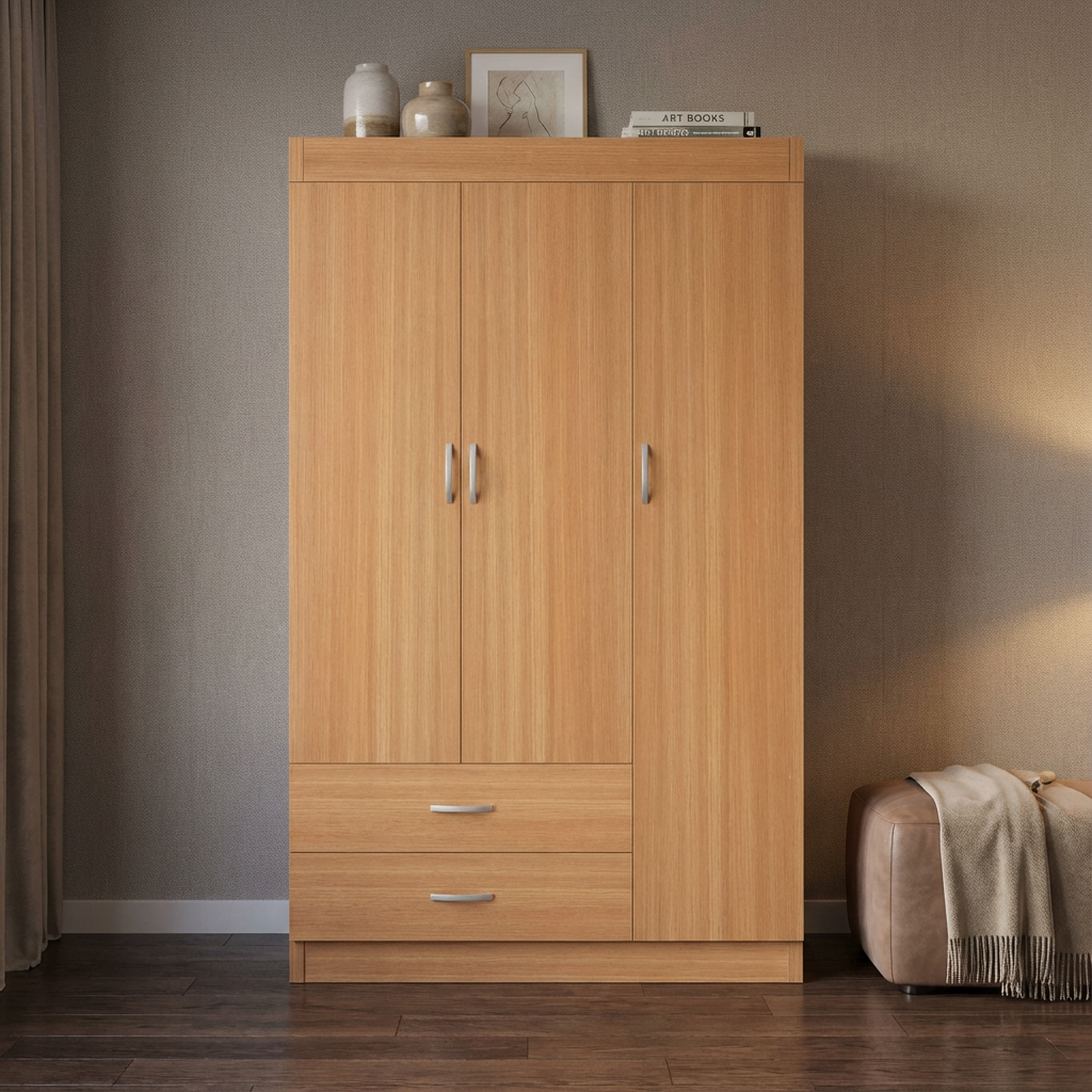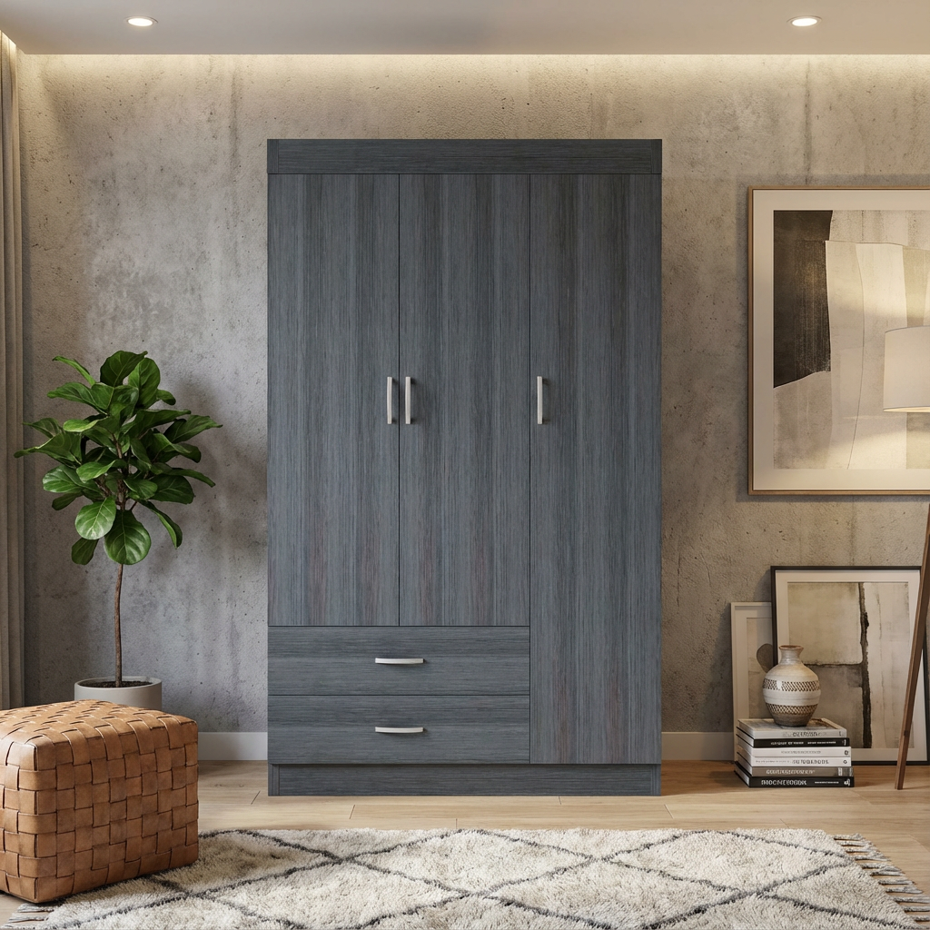 Maximise your storage space with the Quinton 3-door open wardrobe. The perfect spot to organise your clothes and belongings, this wardrobe boasts soft-closing hinged doors for a touch of luxury. Equipped with two drawers and crafted from solid plywood, it effortlessly combines functionality with style, making it a must-have addition to your bedroom.