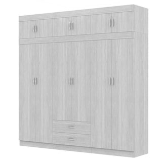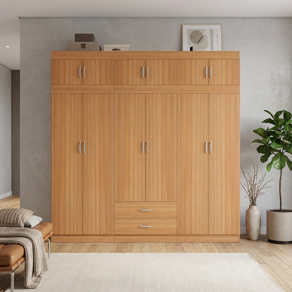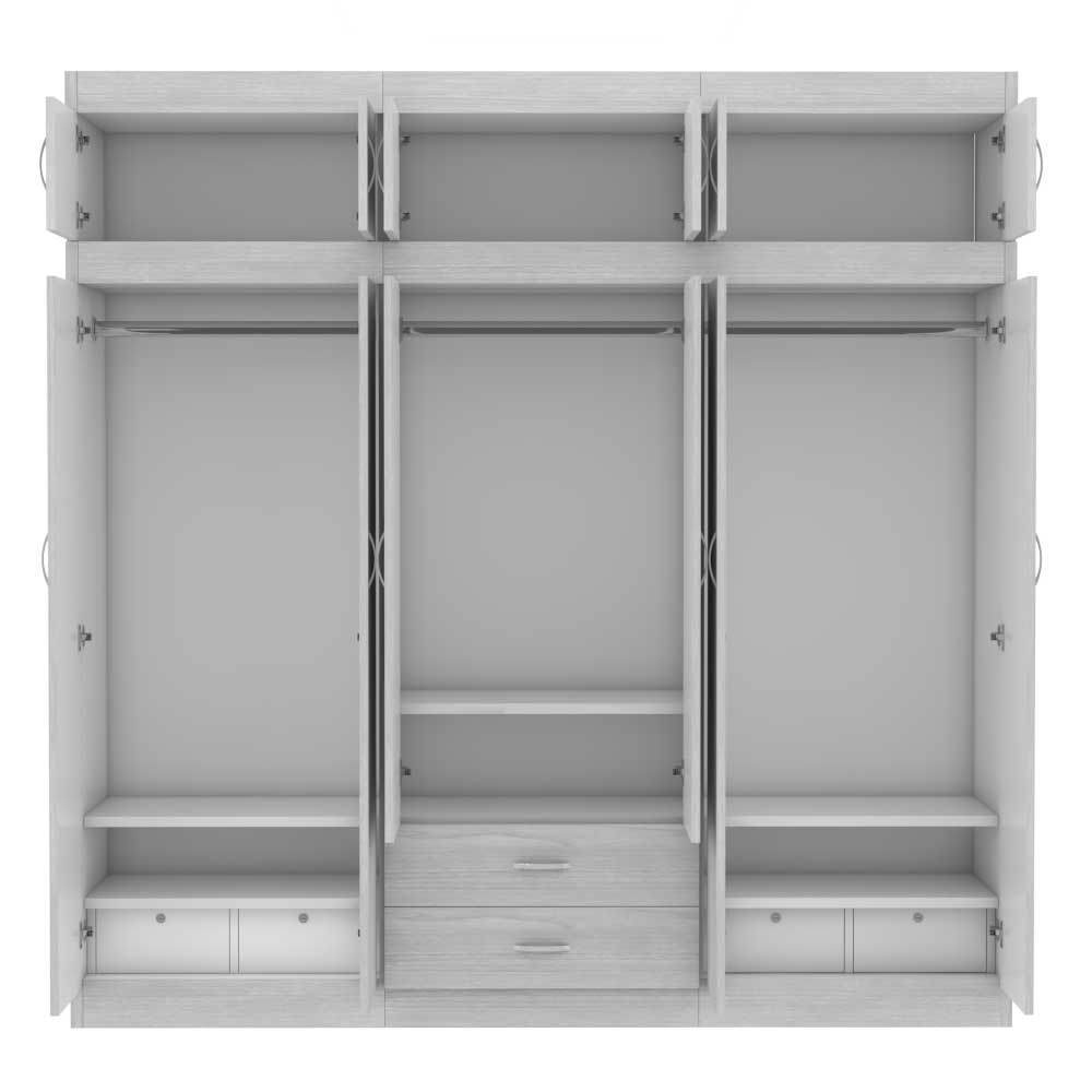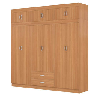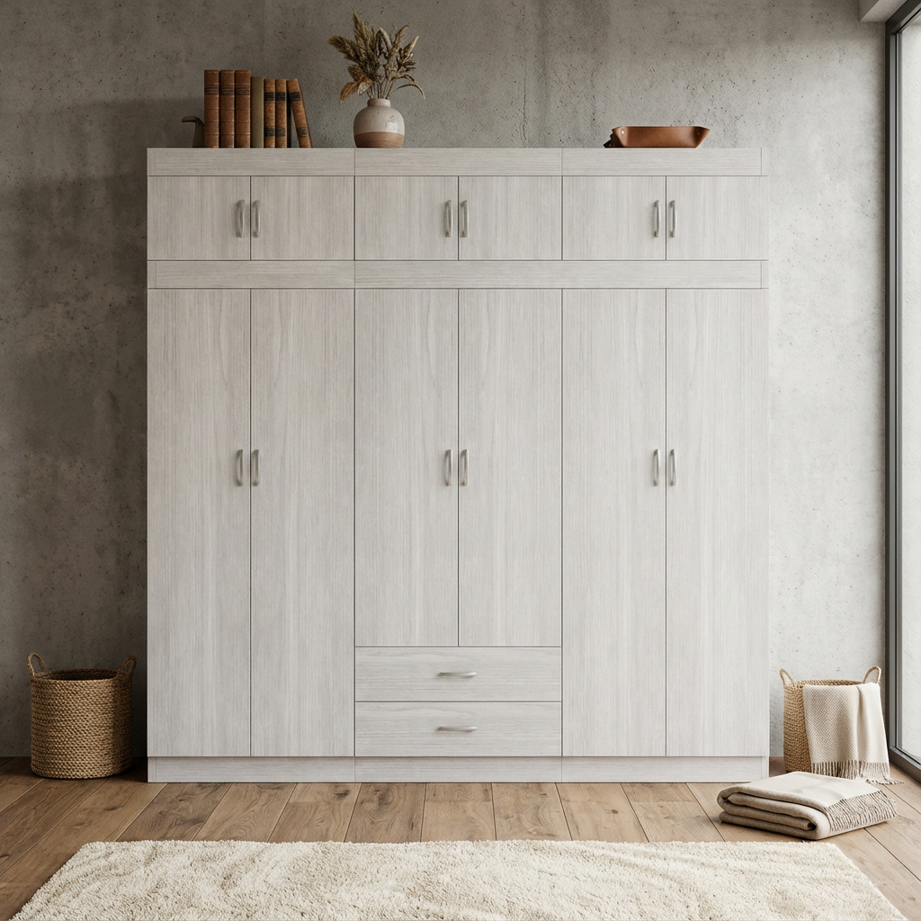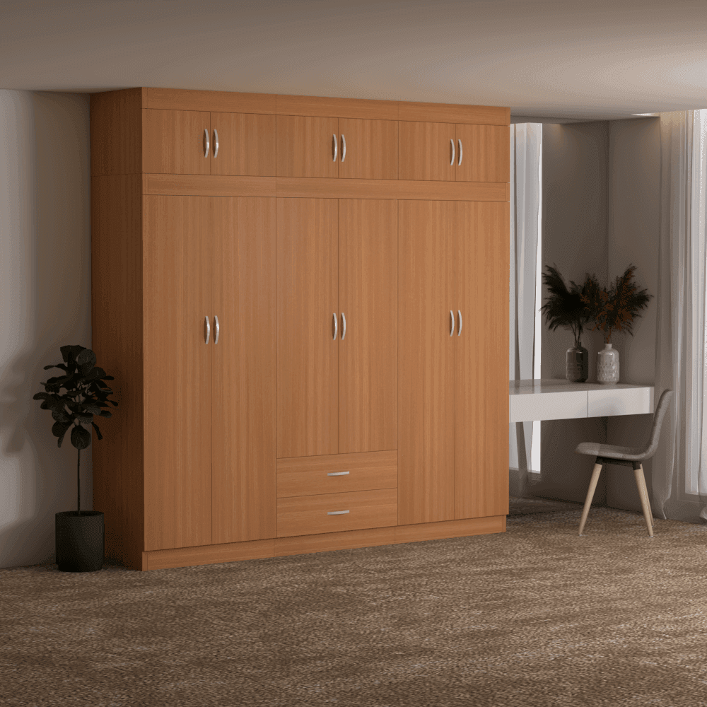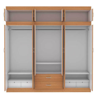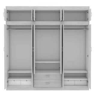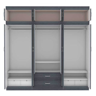 Looking for multiple storage options for your clothes and bedroom essentials The Quinton 6 Door Open Wardrobe with Top comes with various storage compartments to hang office clothes, fold indoor clothes and organise your bedding essentials in one accessible and stylish space!