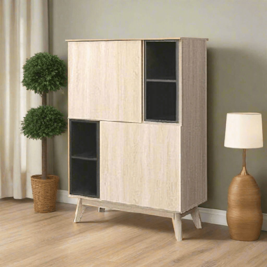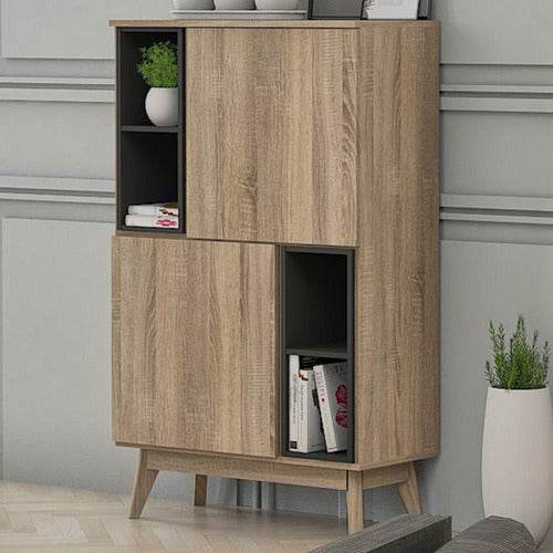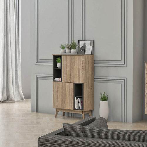 Use the open upper shelves to display your favorite reads, décor items, or indoor plants. The lower section features two doors that open up to concealed shelves, keeping clutter and miscellaneous items neatly out of sight. Whether placed in a living room, study, or bedroom, this unit adds a touch of Scandinavian simplicity to your space.