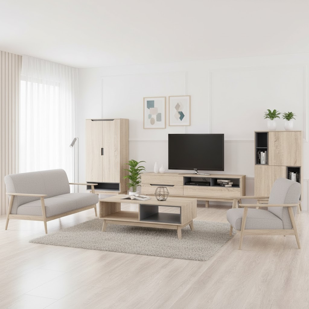 The Trystan Living Room and Storage Set provides a cohesive and functional solution for a contemporary home, blending modern design with essential storage capabilities. Featuring a light, warm finish and elevated legs, the collection creates an airy, sophisticated look while offering practical organization for your entire living space and entryway.