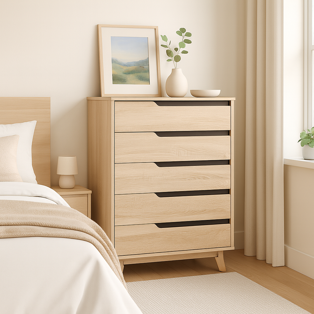 Designed with both function and style in mind, the Trystan Wooden Chest of Drawer features a sleek and simple 5-tier configuration that fits seamlessly into modern homes. Whether you're organizing clothes, accessories, or household essentials, this compact yet spacious chest is an excellent addition to bedrooms, study rooms, or entryways.