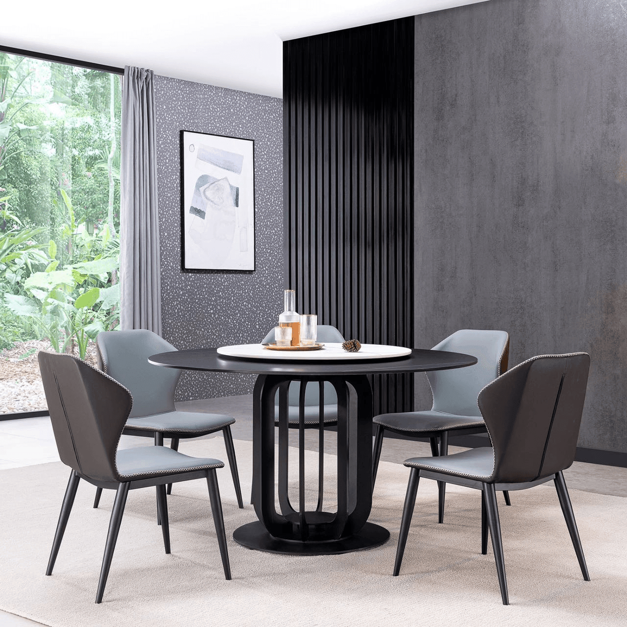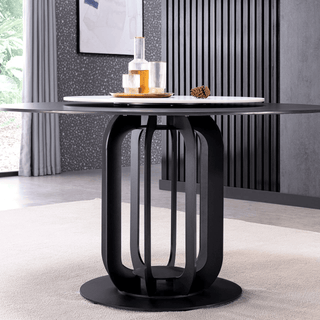 At the center sits a built-in Lazy Susan, allowing effortless serving and a touch of convenience for family-style dining. Its sleek round silhouette encourages connection, making every meal more intimate and enjoyable. The sturdy, artistic pedestal base adds a statement of contemporary sophistication to any dining space.